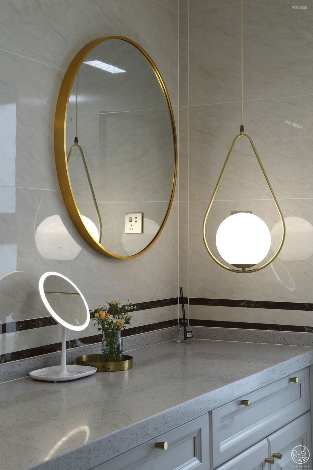 主卫与次卫色调相近,但是风格却大相径庭,主卫用白色纹路大理石搭配上黄铜的几何灯与圆形镜面,描绘出雅致的家庭生活情景。