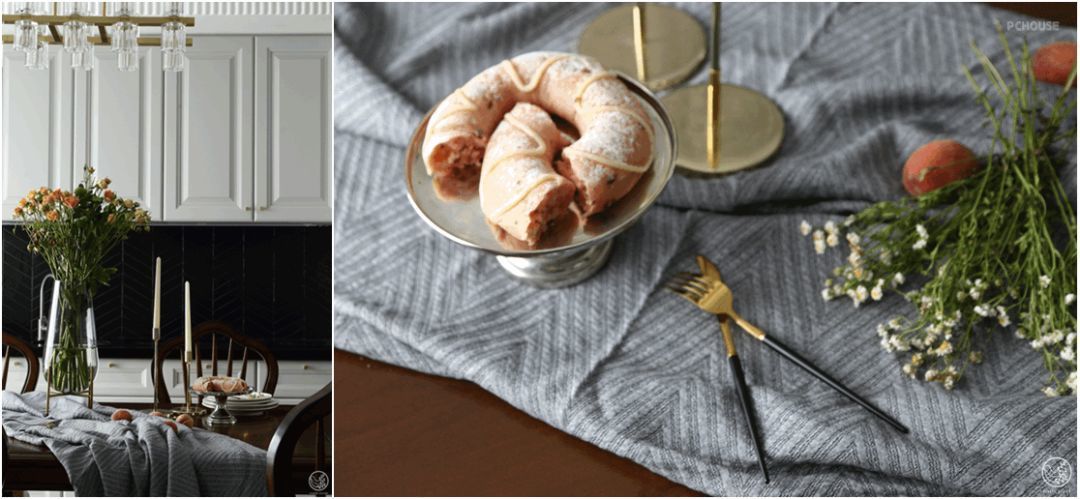 客厅与餐厅相连,相较于客厅整体偏轻盈的色彩基调,餐厅在延续的基础上,搭配了黑色人字形瓷砖以及深色的餐桌,让整个空间显得更为协调饱满。