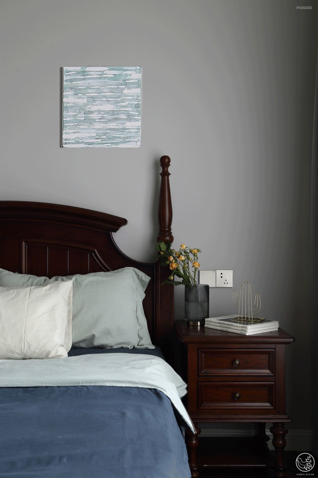 主卧空间以莫兰迪灰搭配夜空蓝、黄铜材质、与家具相呼应的木纹地板,棉麻与金属,木质与陶瓷,在灵动感与舒适度间密切交叠,雅适而简约。