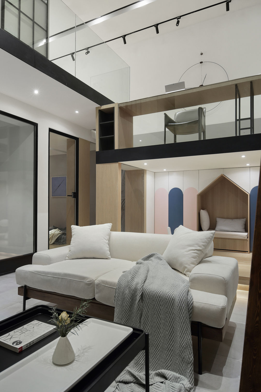 在整体色调的定位上我们延续黑白灰所带来的冷峻感,同时用木色调去做一定的缓和.儿童的元素则体现在色彩上的变化,在孩童活动区中,通过一些粉色和蓝色的组合门板去做变化,门板的造型则通过半弧形的组合去体现小孩所喜欢的一些元素,木屋子的造型则可以满足小孩平时在上面看书、玩耍........ 地面的抬高强调了空间的区域划分,而体块组合的多功能盒子则利用空间层高做了上下叠分,下面强调了小孩活动的区域而上方则满足了大人平时偶尔办公的需求.
