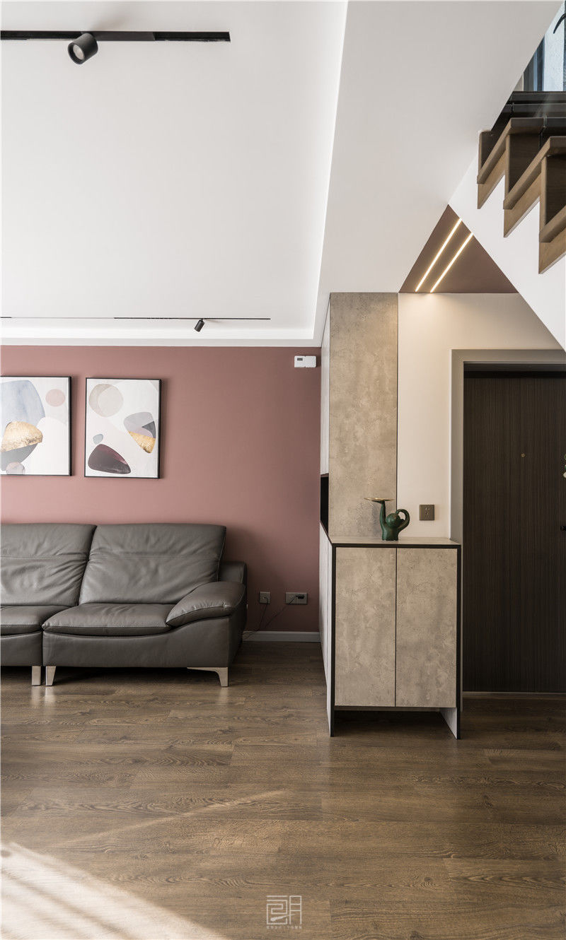 进入门厅,入眼的便是楼洞,难免有压抑之感,但是所在小区有严格的规定不能更改楼梯的方向,设计师只能通过色彩和灯光以及软装搭配,尽量改善业主的直观感受。