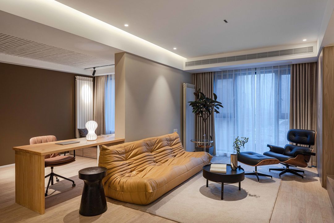 在家具形制上也以简洁经典为主,选择LIGNE ROSET的经典TOGO三人牛皮沙发与RAY EAMES的经典单人躺椅,这样的家具不仅提供了不错的舒适度与功能性,还不会喧宾夺主,与其他空间形成了和谐统一的整体。