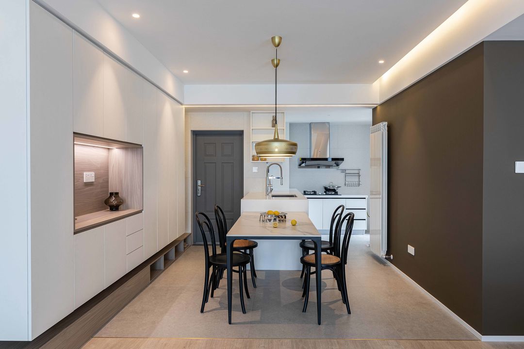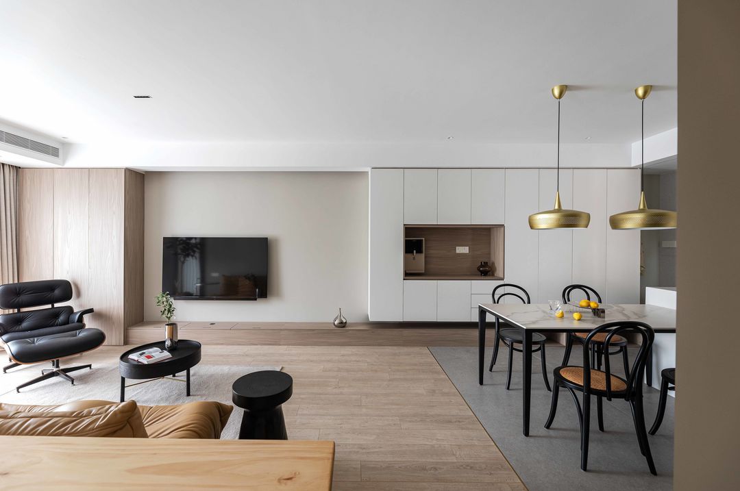 入户后尽收眼底的客餐区是白色基底搭配特调的深浅咖色上墙,是理性的土老师与温柔的琪姐之间的魅力碰撞。