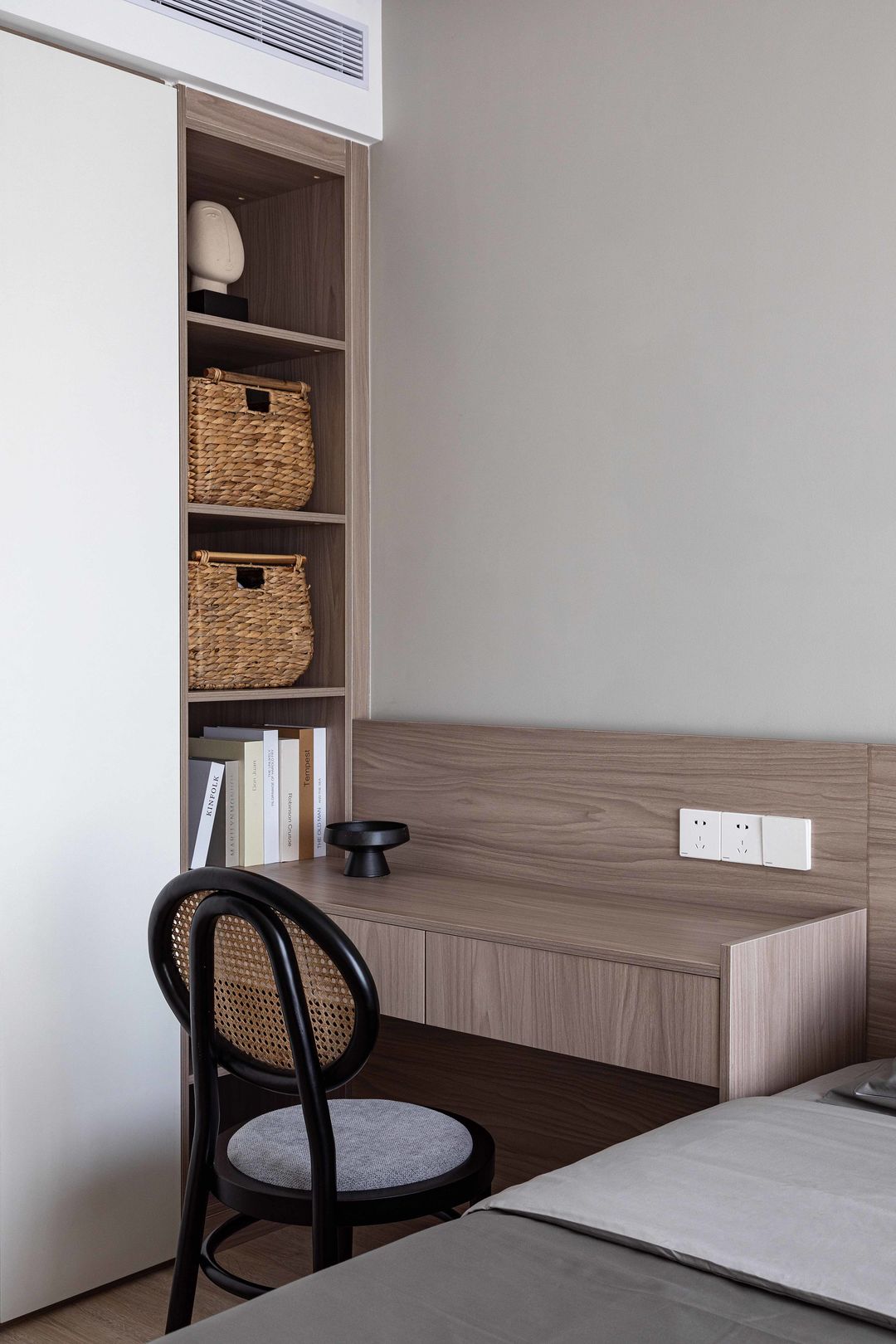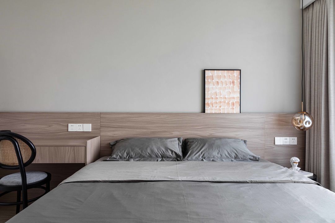 延续特调的浅咖至主卧,有趣的是,干净统一的底色恰巧与小区的外墙形成了默契。橡木的纹路肌理透露着大自然留下的痕迹,与墙面和茶玻床头氛围灯相互呼应,产生奇妙的美学反应。