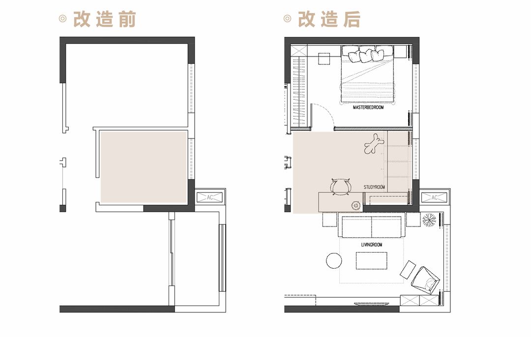 ● Solution 1. 考虑小套3的房子仅作为他们的过渡房,所以不用考虑太多收纳和留宿等因素。根据夫妻俩的需求结合常住3口人的情况,我们考虑只保留两个房间,拆除一个房间作为办公区和亲子空间留给舒颜与家人。