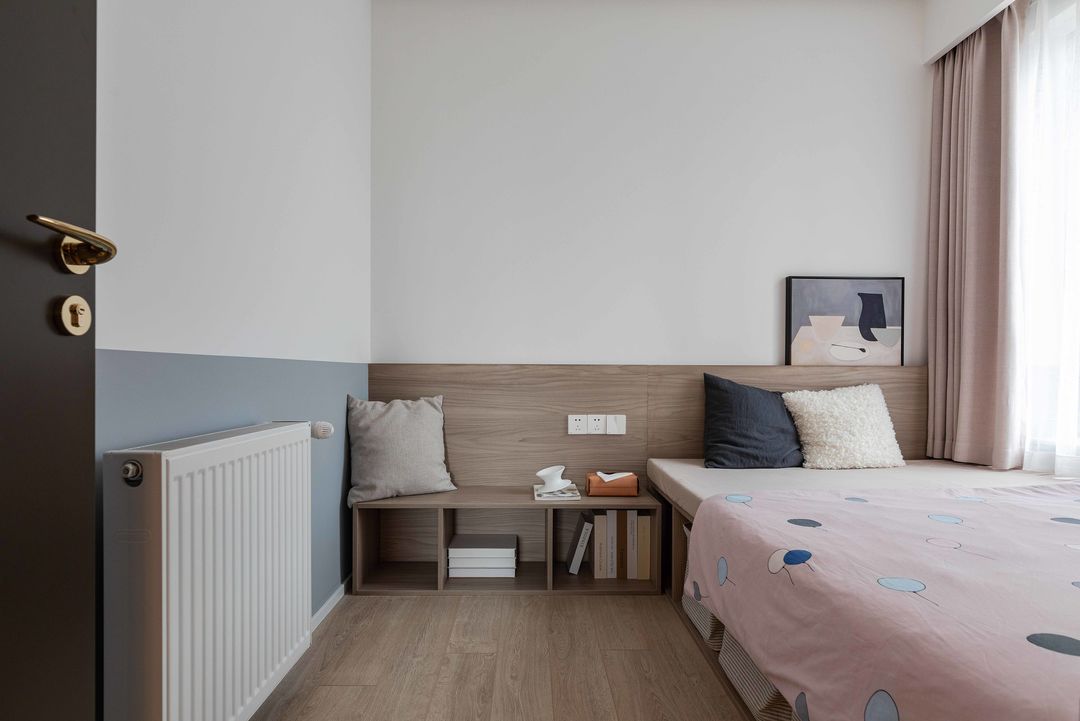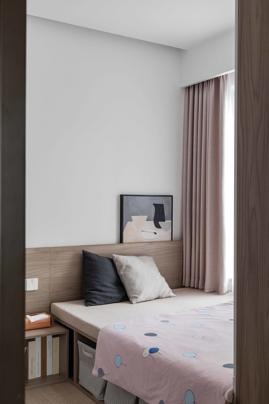 儿童房不大,为了保证有一定的收纳空间,以榻榻米+定制柜的形式呈现。由于小舒颜年纪太小,直到2岁以后才考虑与父母分床睡。