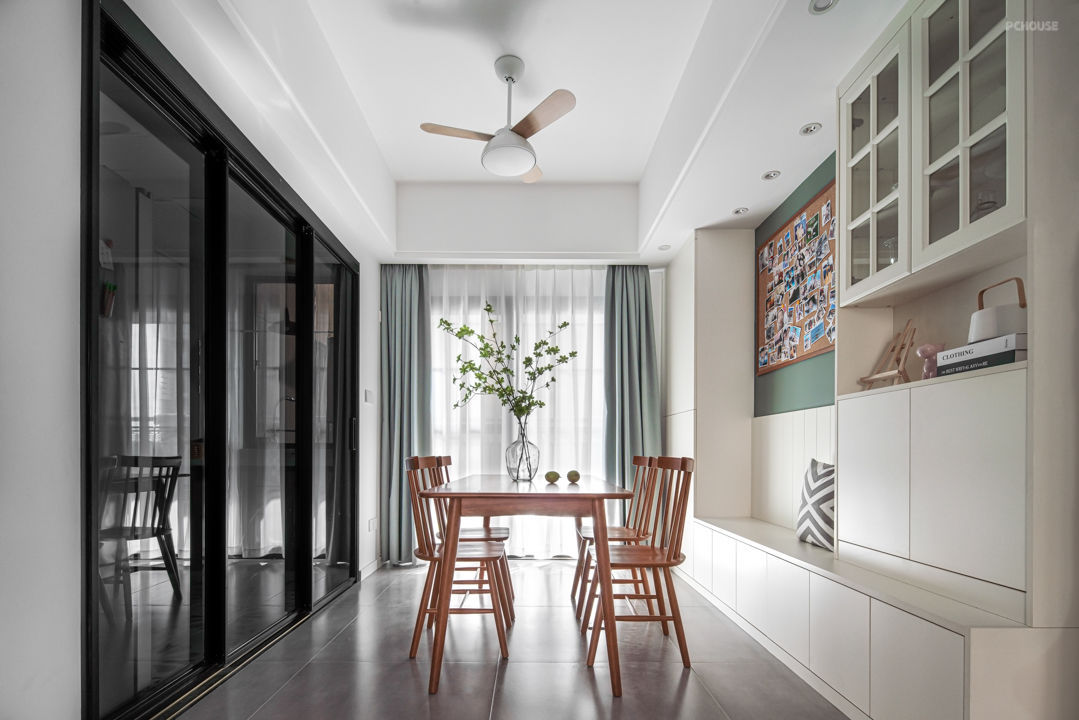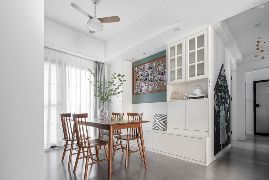 餐厅一字型卡座设计,卡座下面设计收纳,既可以储存物品使用,也能满足业主平时的用餐需求,平时是业主3人用餐,有客人来也可以满足5-6人的需求。 温润的木质长方形餐桌让三餐更具温馨氛围。白色的柜子加入木色家具的搭配,让整体的效果更加自然大气,更有空间层次感。