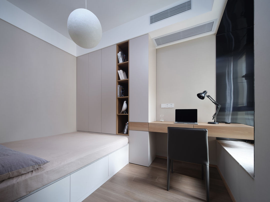 沿墙设计收纳能力超强的榻榻米,一步到位解决睡眠、收纳空间藏露适比,还顺手解决了书柜、书架的需求。柜体中部向飘窗延伸出悬空设计的书桌,造型轻盈,简单实用,满足高三考生备考所需。