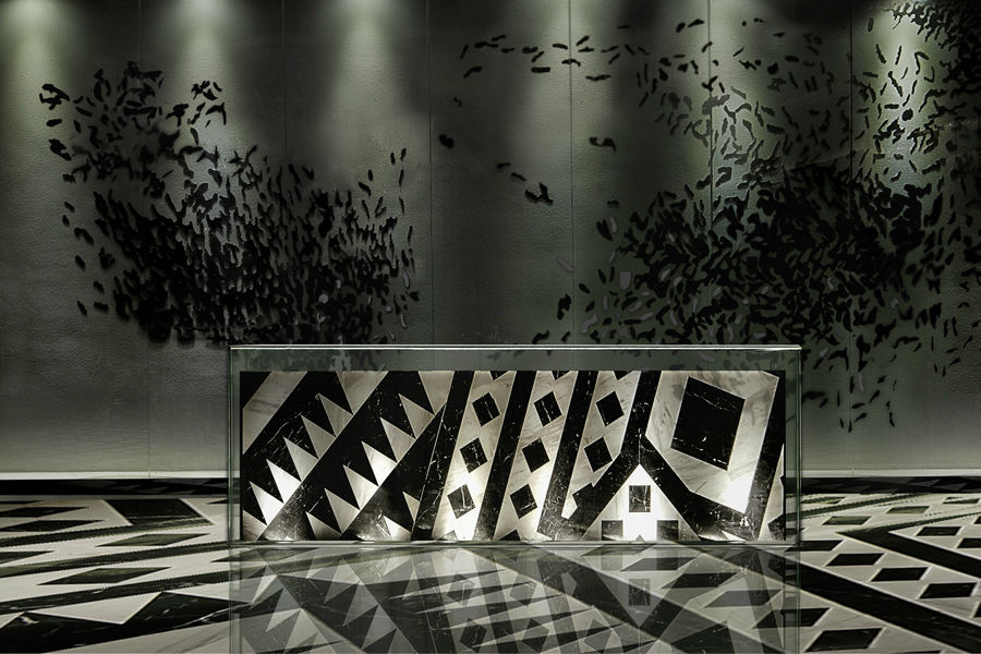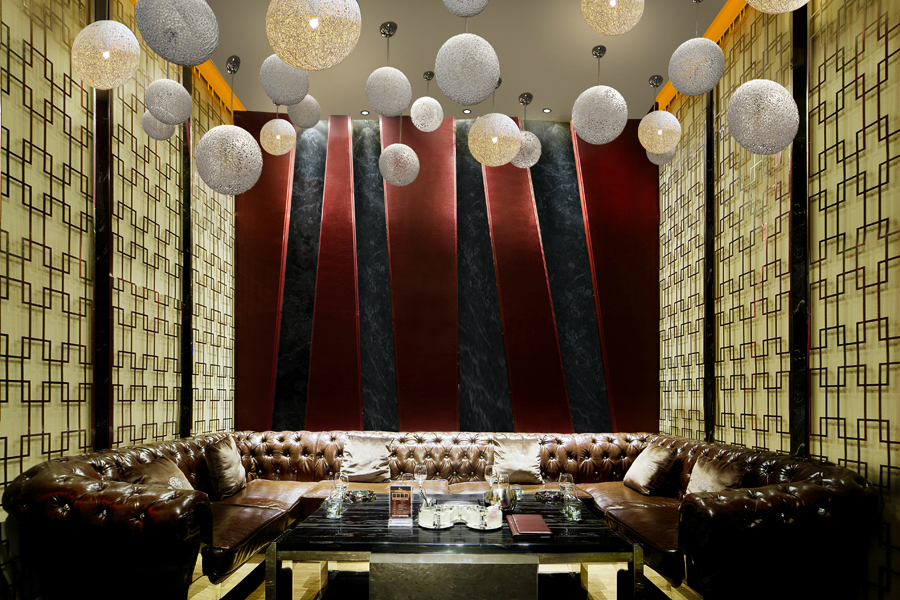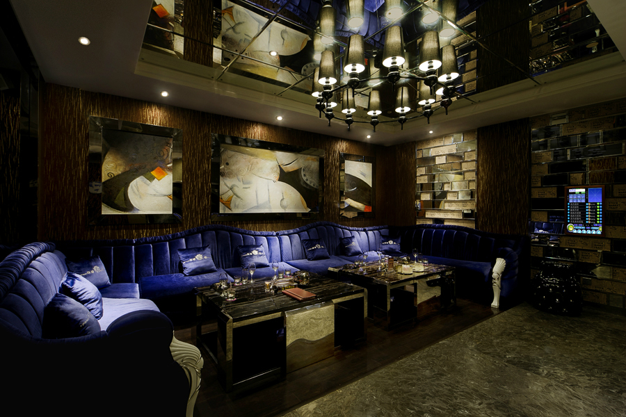 环球五号KTV,是一家以高端定位为主题的休闲娱乐场所。进入大堂,黑白灰组成的平面构成,极具视觉冲击力,从地面一直延伸到服务台,且增加了灯光进行强化。为了不损坏使用率极高的服务台,特采用了钢化玻璃进行包裹,既美观又实用。天花上布满了错落的水晶灯,则不按常规套路出牌的摆放方式当客人进入大堂,则不会那么拘束,放松心情,释放能量。