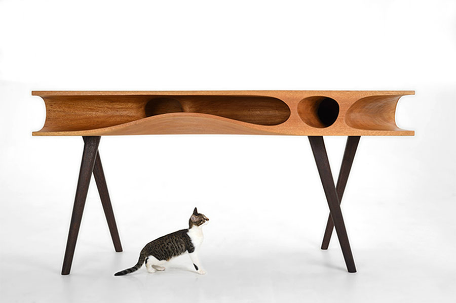 养猫的人都曾有过如是体验:其一是把蜷缩成一团的猫从你的腿上放下,总像是一种仪式般的略带伤感的告别。其二是当猫面对有只有它一头大小的孔洞,总会奋不顾身一头扎进去,在狭小的空间里掉个头跑出来,再次钻进去,并乐此不疲。《CATable / 猫桌》的设计试图结合以上两种体验,为人和猫的互动营造一个完美的场所。它既是一张实用的桌子,又是一个猫的乐园。