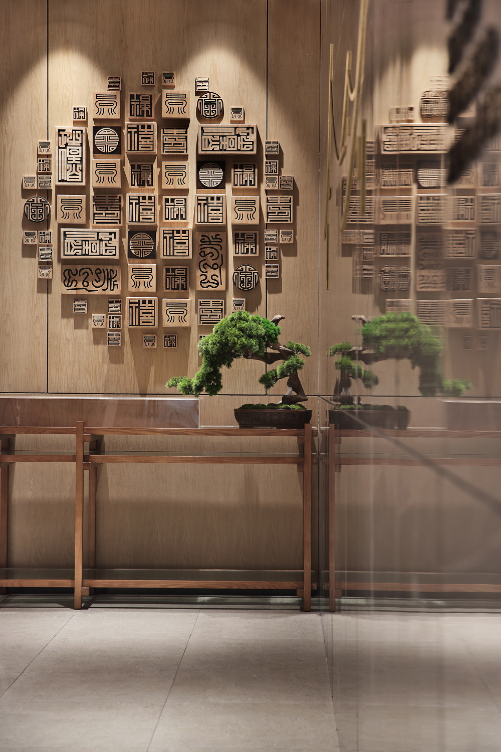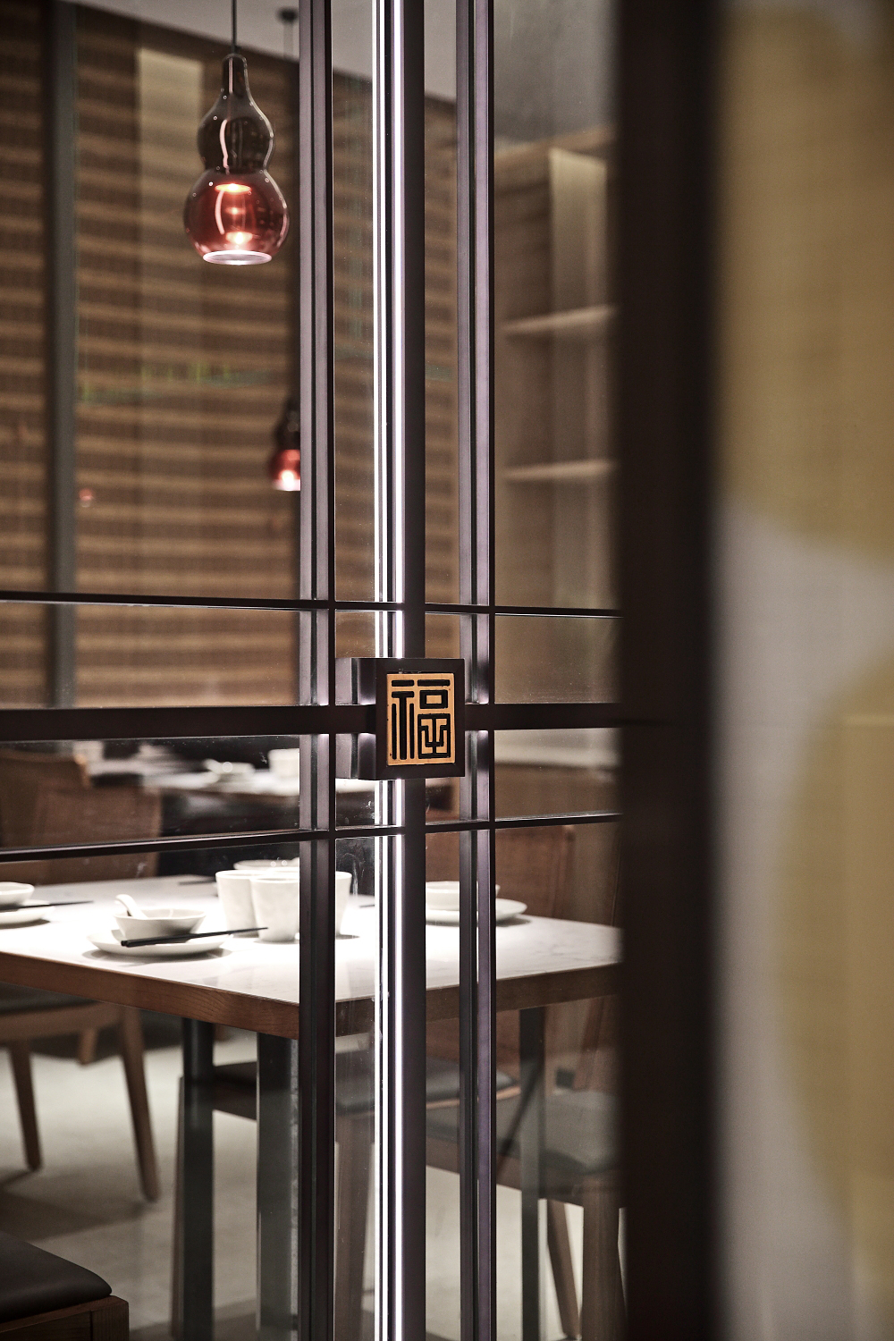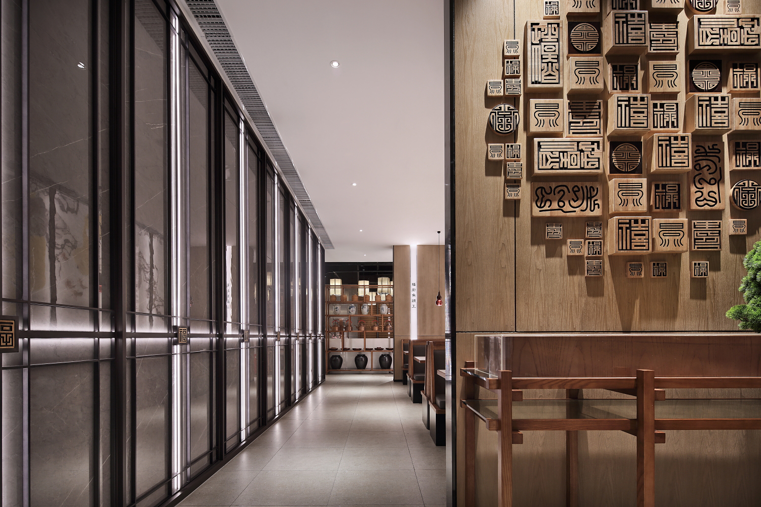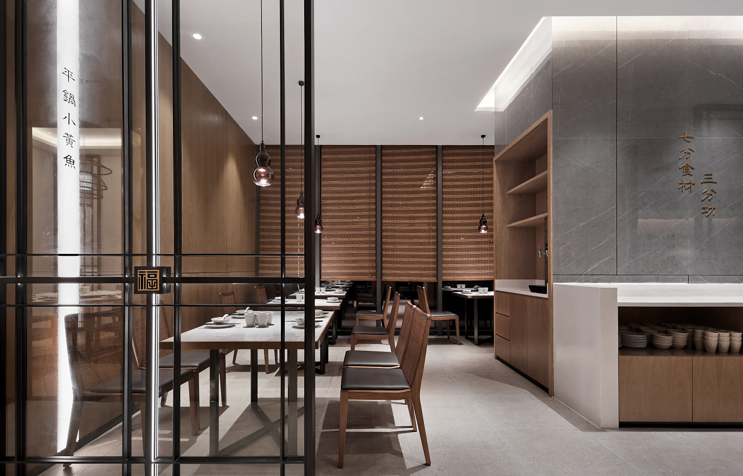 众星捧月般的“福”是空间的点睛之笔。设计师用现代手法演绎福的概念,以朴实的材质营造简约、精致、有温度的用餐氛围。