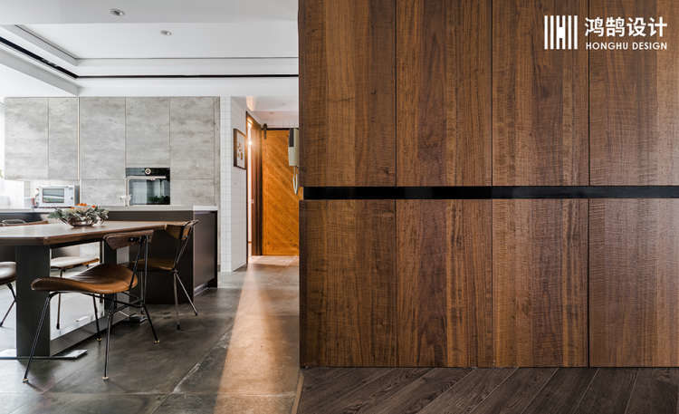 重新设计过的厨房与餐厅之间的动线也变得十分流畅起来,中岛的设计让西厨完全会中厨分割开来,互不影响,包豪斯实木铁艺餐桌 与中岛吧台相连,为读者提供了更多使用的可能性。吊顶上面做了黑色的一圈,也是为了整体风格考虑做的一个线条设计。