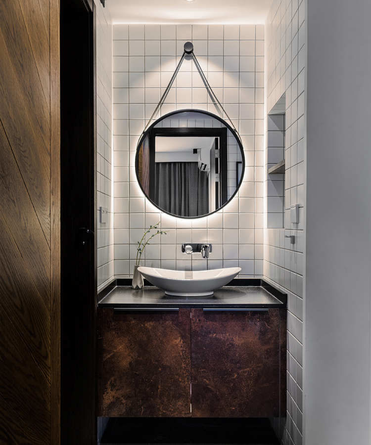 这个卫生间的干区部分也算是本套作品中,我个人比较满意的一个部分了,而且这里的设计也是有个小插曲的,原先业主把镜子买回来以后发现并不是我给的那个意见里的,买错了,后面我想到了灯带的处理,反而将其拨乱反正了,成为了一个很独特的风采区;很多媒体在采访我的时候,都有提及到这一区间的设计,都觉得是点睛之笔,个人也是很喜欢的。