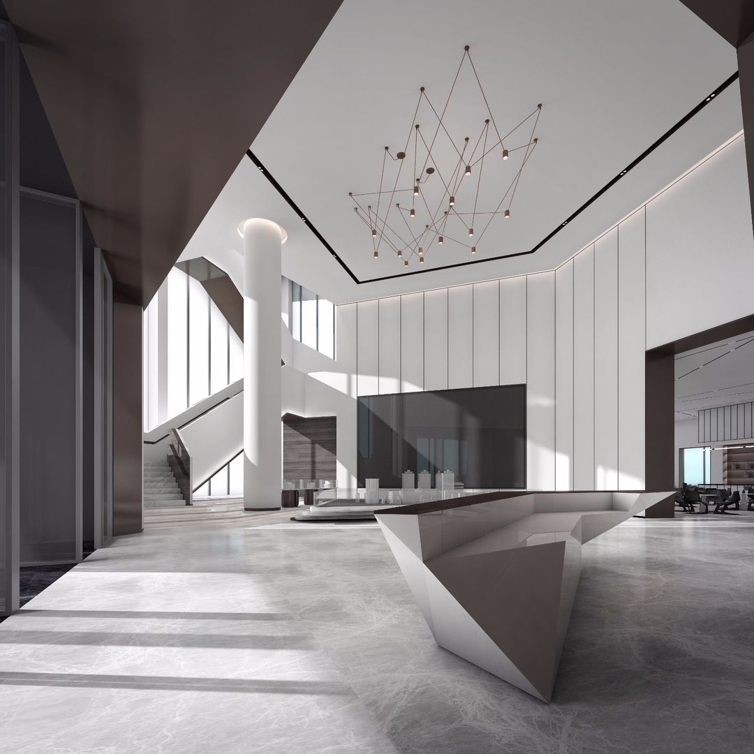本案建筑运用大面积的玻璃幕墙、大理石、不锈钢及几何构成方式去诠释整个空间。