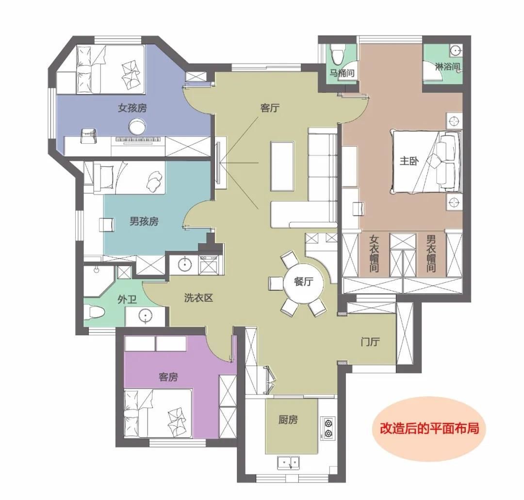 其实如果不住6个人,原来的户型这点通道也不能算是浪费,通道大也很好,但是因为要改成4个房间,还要保留2个卫生间,只能是把没有充分利用的通道用起来!