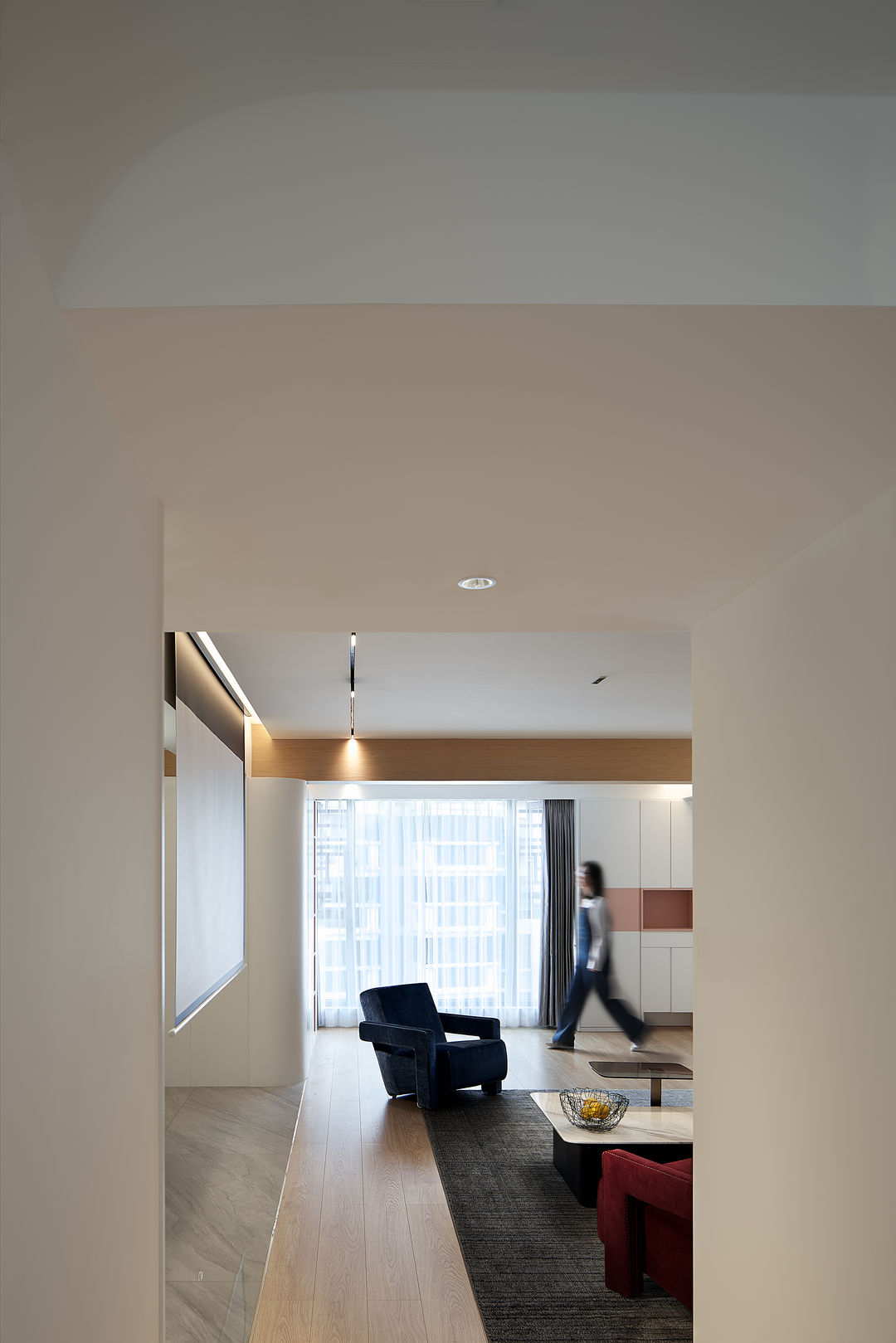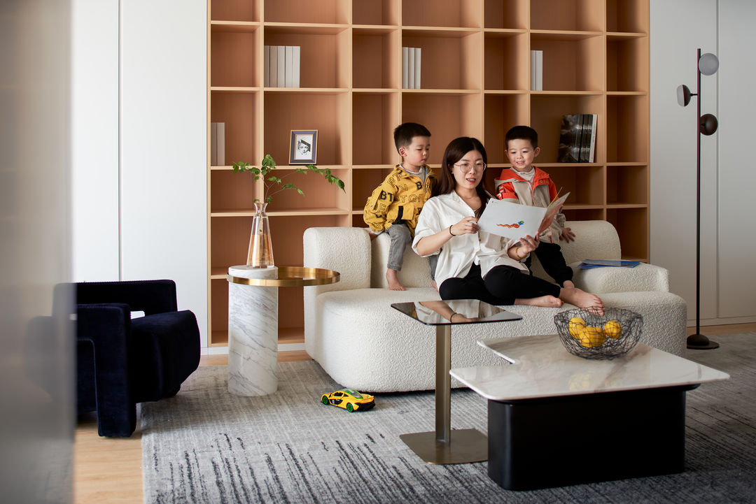 客厅是一家最爱待着的地方,一家四口围坐在沙发周边听妈妈讲那过去的故事,畅想着未来的美好生活。满屏的书架给孩子营造了绝佳的阅读环境,需要休息时可以把隐藏在灯槽里的投影幕布放下,看看电影、听听音乐.