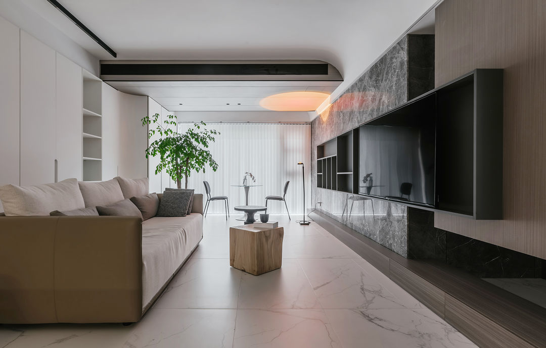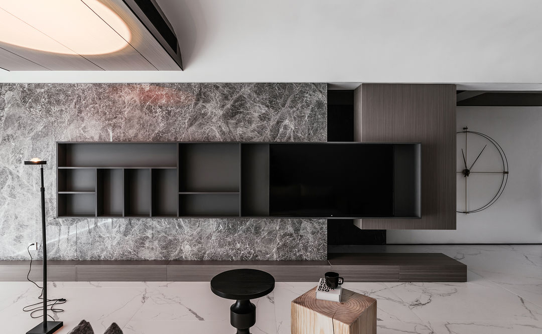 客厅的电视背景墙设计,从石材基本面跨越到另一个悬空的立方体上,然后形成了一道天然的L型透景,整个跨度拉伸了客厅的空间感,同时也给主卧的门做了很好掩饰;#客厅 #电视背景墙 #电视柜 #瓷砖 #大理石 #吊顶 #无主灯 #落地灯#极简