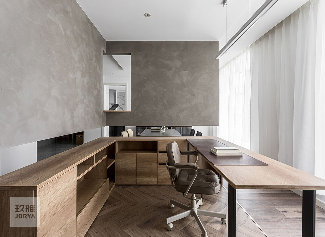 首先墙体不是由地生,而是从顶下。以半悬的姿态规划出书房区域,下探高度超过视平线,也就是无论站或坐都看不到书桌,保证了隐私性。