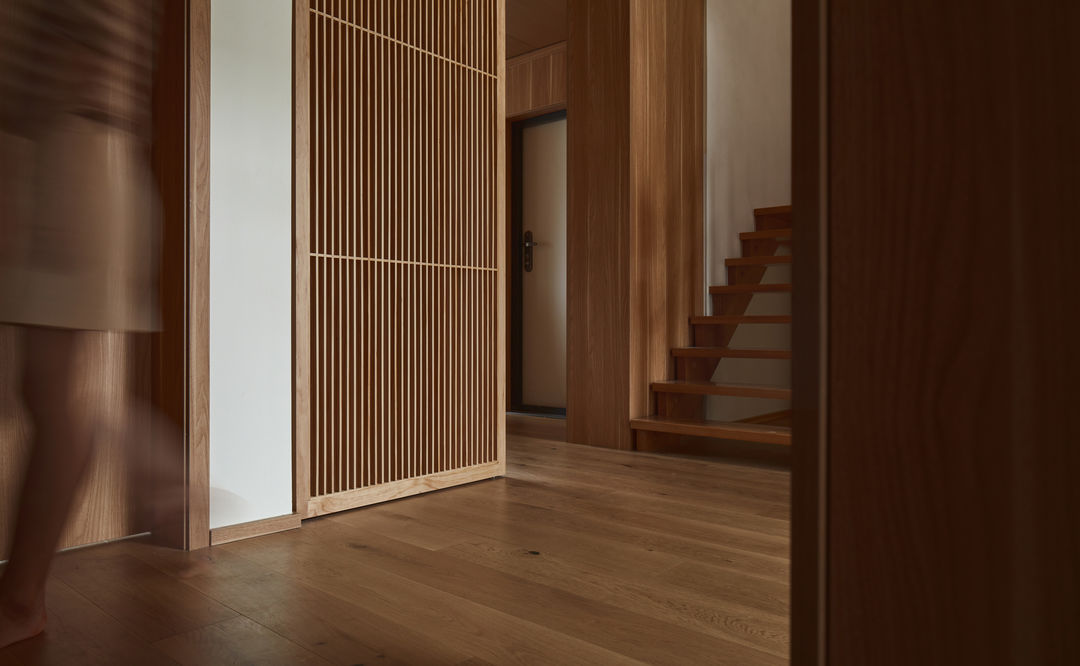 梯间与起居采用“虚墙实隔”,既起到扶手跟安全需求,也不完全隔断两个空间,让相互都有视觉的延伸;