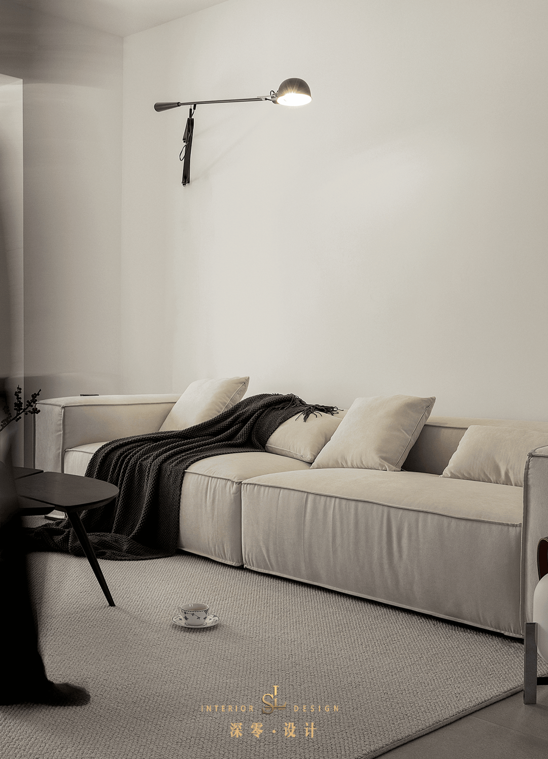 同样留白的沙发背景墙用一个壁挂灯具实现局部照明和装饰作用。