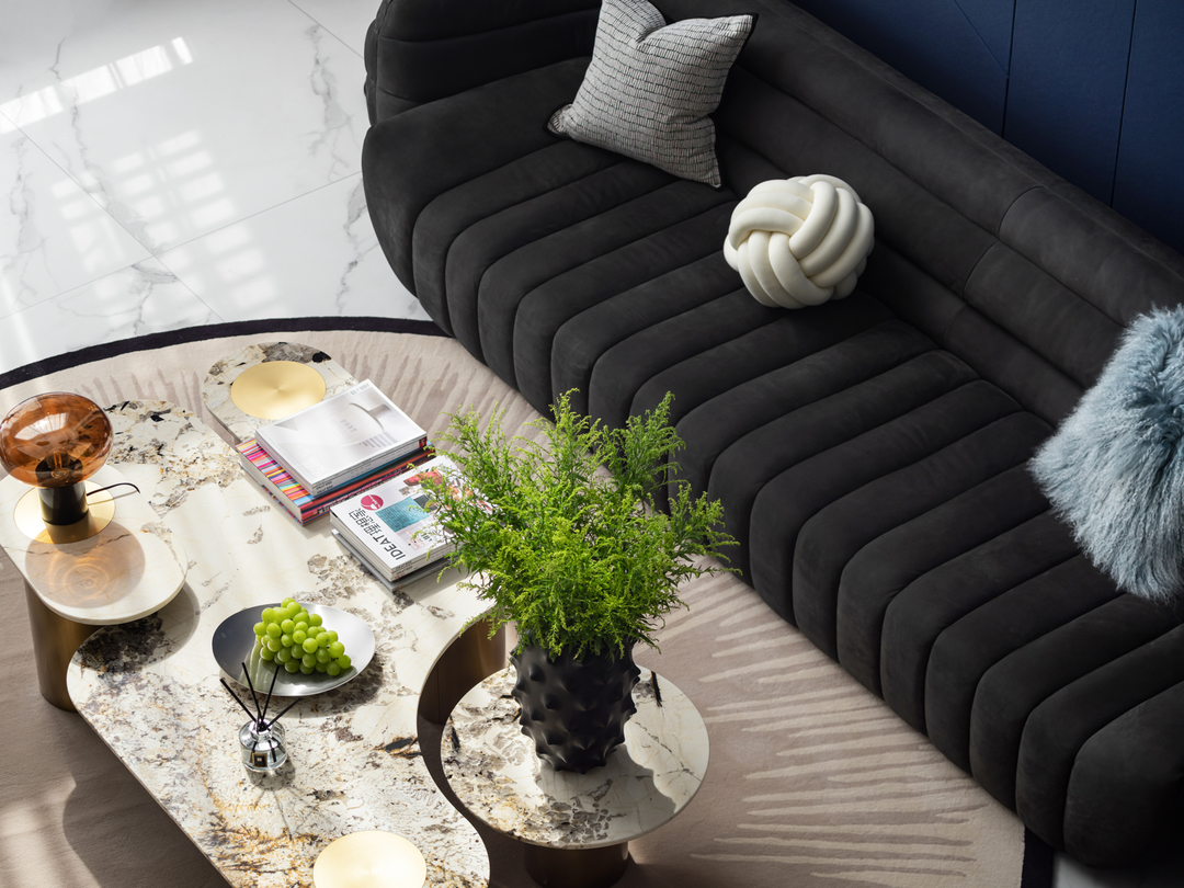 三种高度的组合茶几,营造出不同模式的会客场景,也成为家人欢聚的好地方,老爸看着书,女儿窝在沙发上撒娇,妈妈笑着端来水果,天伦之乐,是最高级的氛围感。