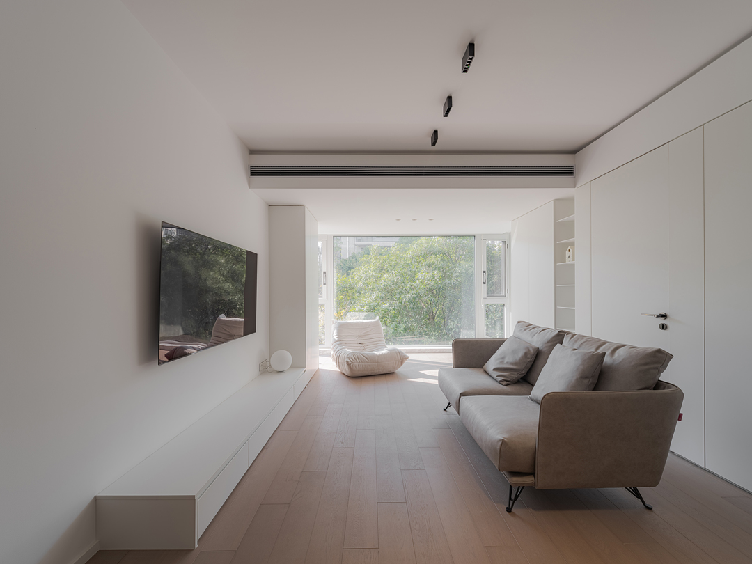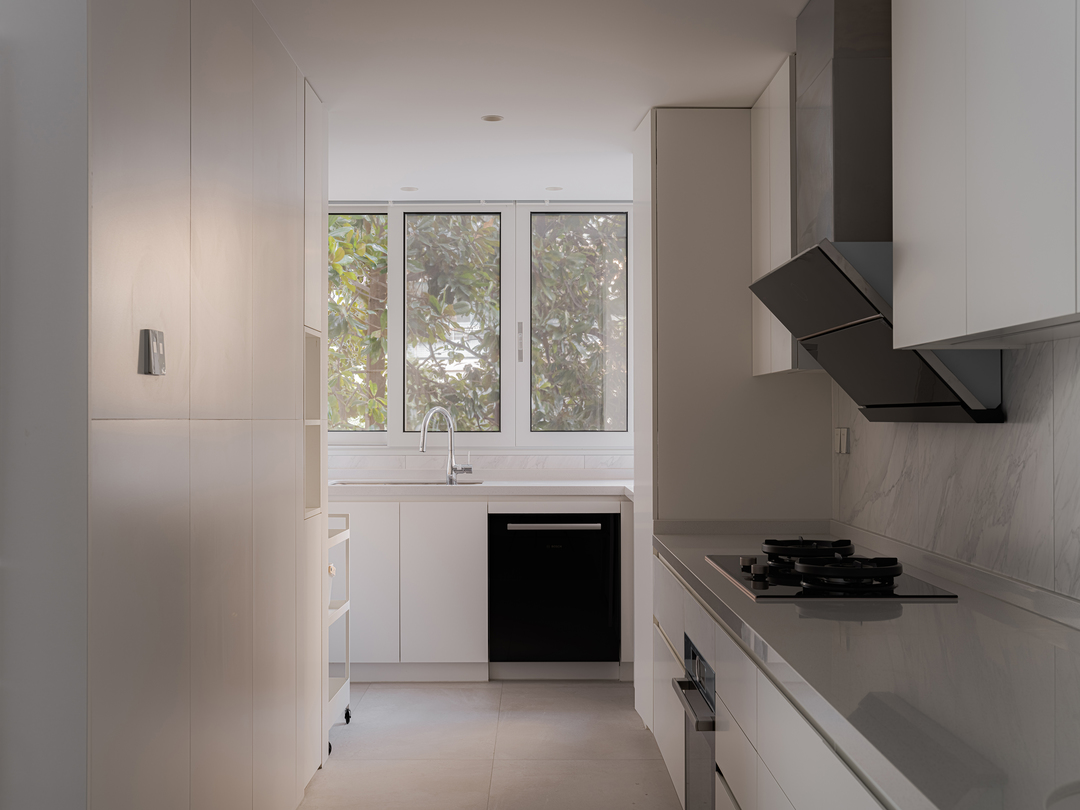 本案正好也有这个条件,可以实现业主的这个LDK梦。我们在原基础上走得更远:把客厅阳台并入,把厨房阳台也并入,强化了两端的采光互通,让空间视觉进一步的延伸。窗外的景色也很不错,可以很好地借景。