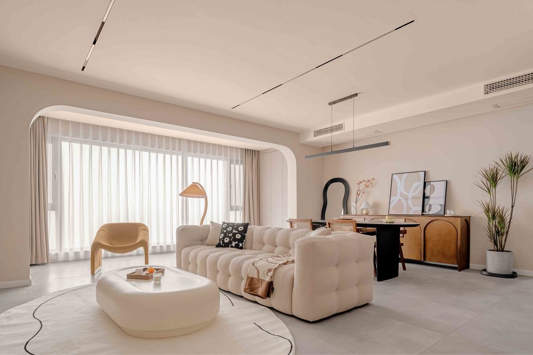 屋内整体色调选择了不会给眼睛太多负担的“干净”色彩:奶色为主,原木色为辅。为避免单调,试图打破“规矩”的感觉。软装上选择了造型圆润流畅的椅子,圆形餐桌(配一张有垂感的不规则形状桌布)和球形抱枕,与拱形门相呼应,为空间增添生动的气息和趣味感。