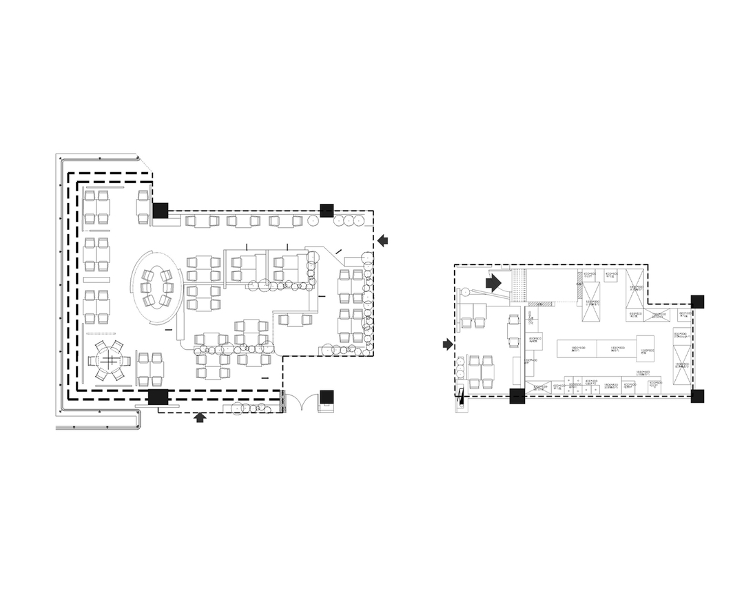 @合壹空间设计:此处是两个分离的空间,如何合理地分配用餐区与后厨区,以及对于餐桌椅的分布摆放,怎样能避免浪费,都是十分重要的。