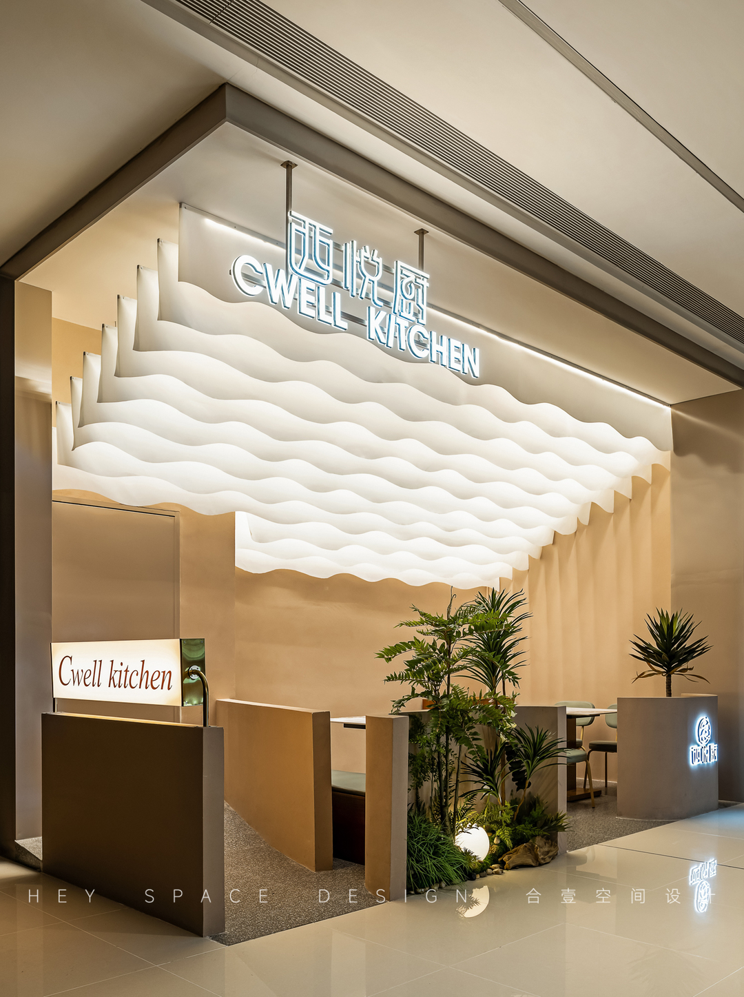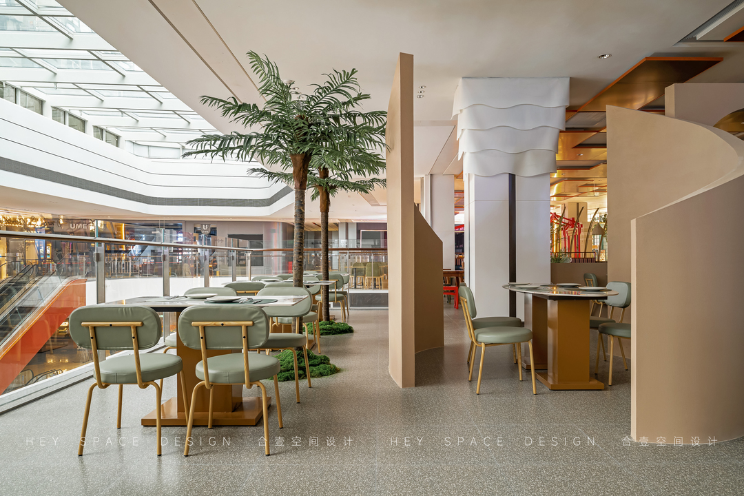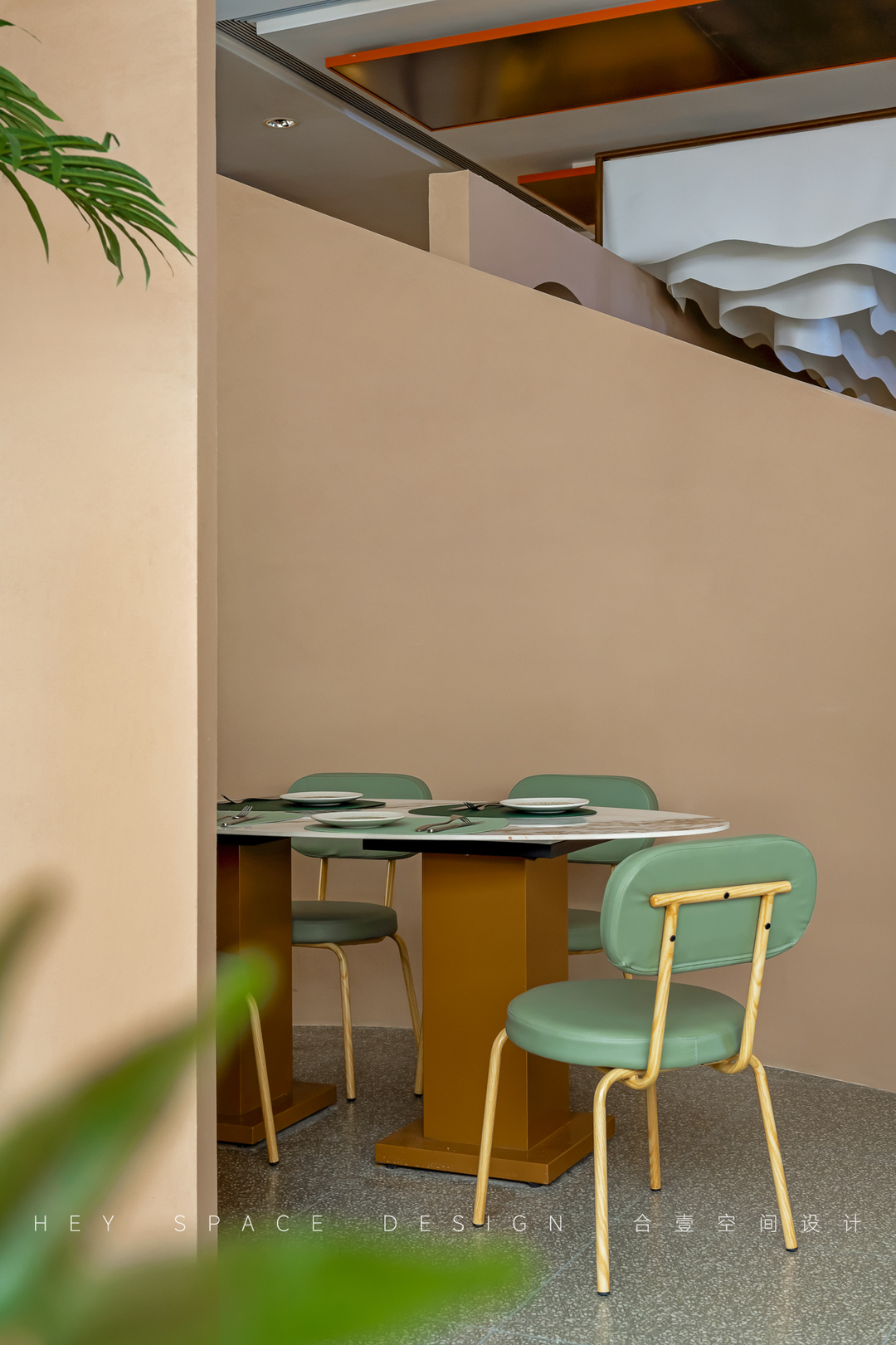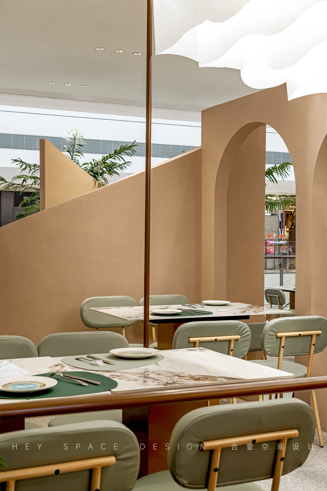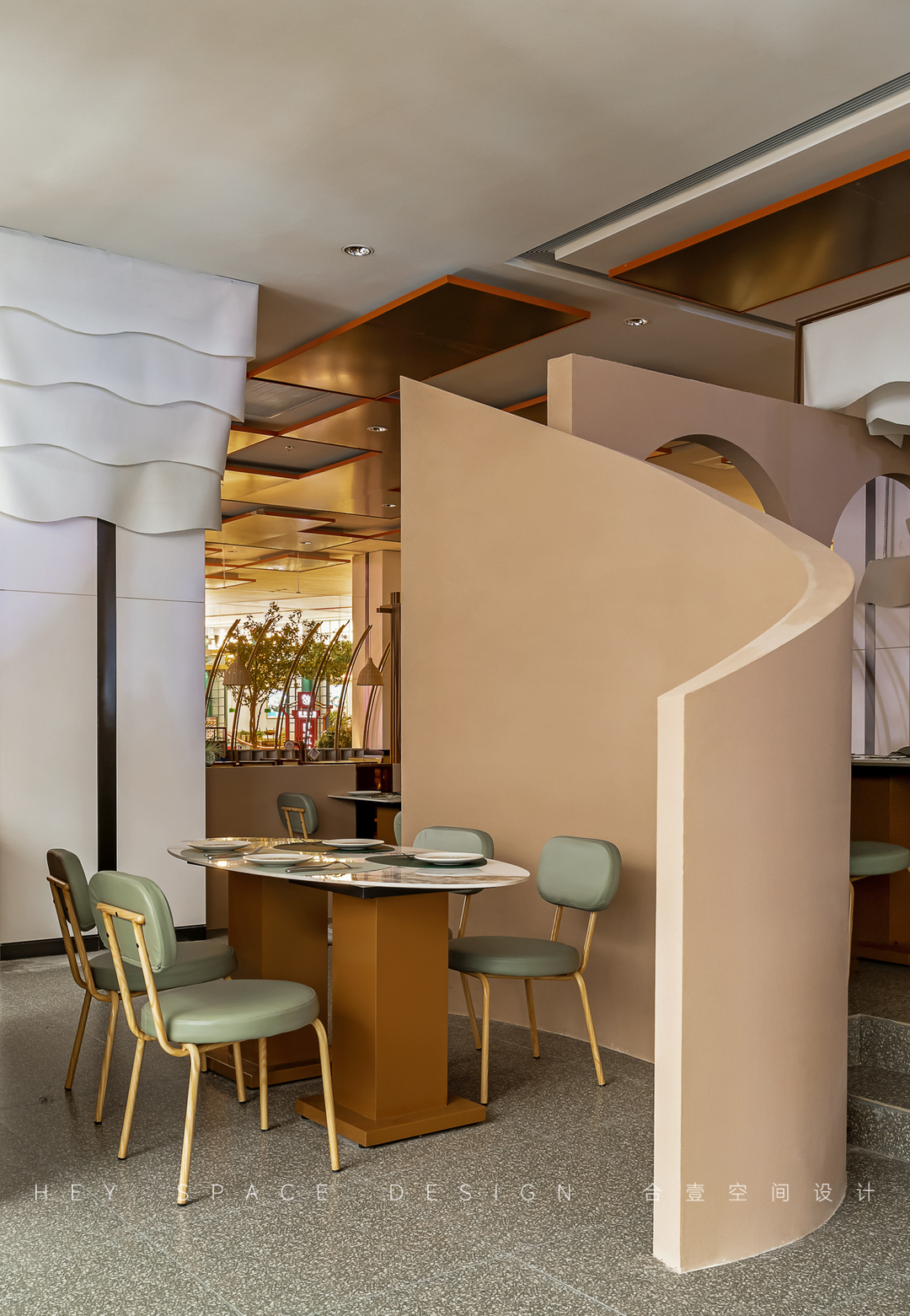 @合壹空间设计:弧形的曲线空间,留出一隅的静谧,给予顾客一个松弛且自然的用餐氛围。