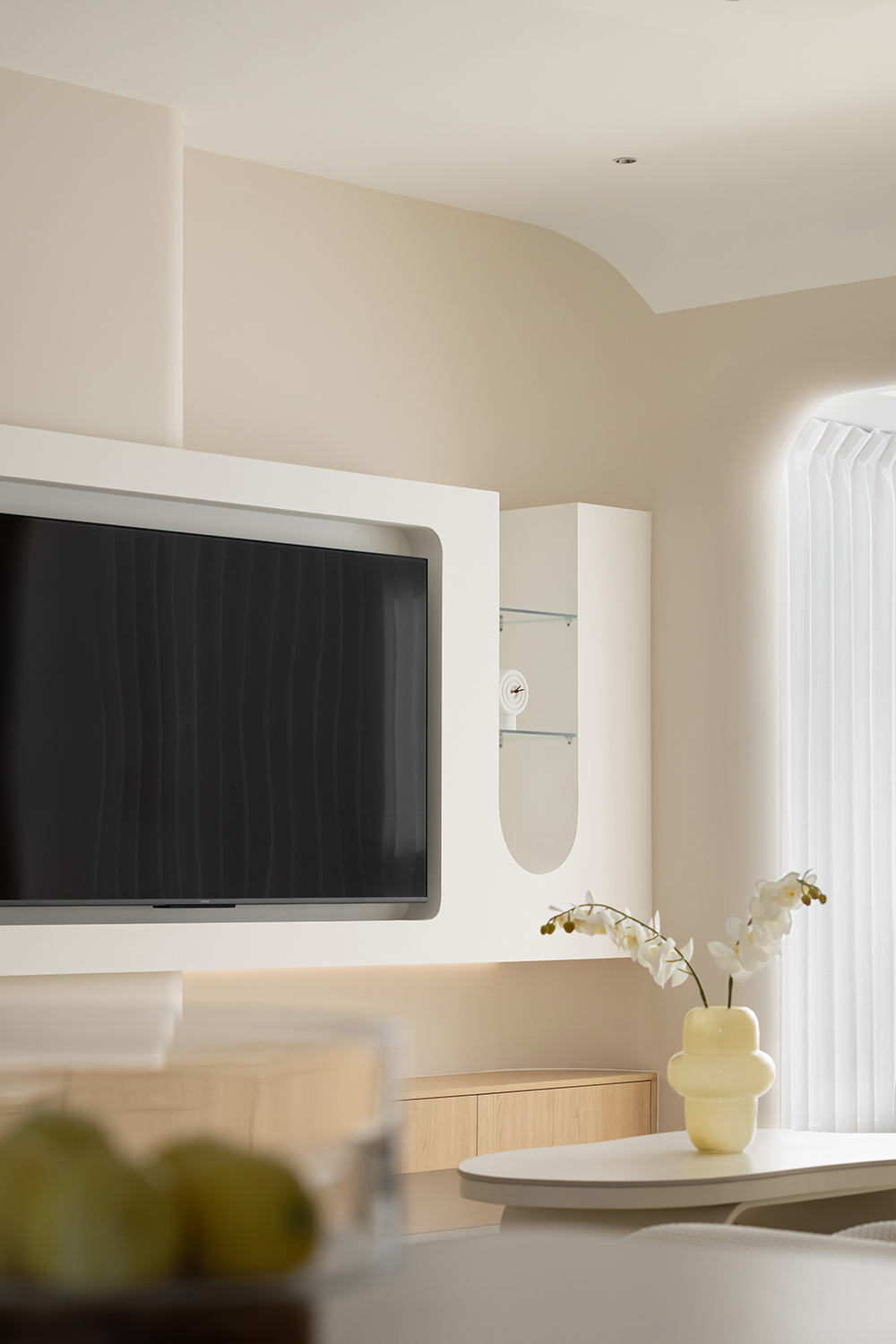 奶油色弧形墙将白色电视柜嵌入其中,电视也采用嵌入式设计,侧边U型造型中间安装亚克力层板,打造开放式展示格,奶油白和原木的质感搭配,构建无需言语的温柔极简空间。