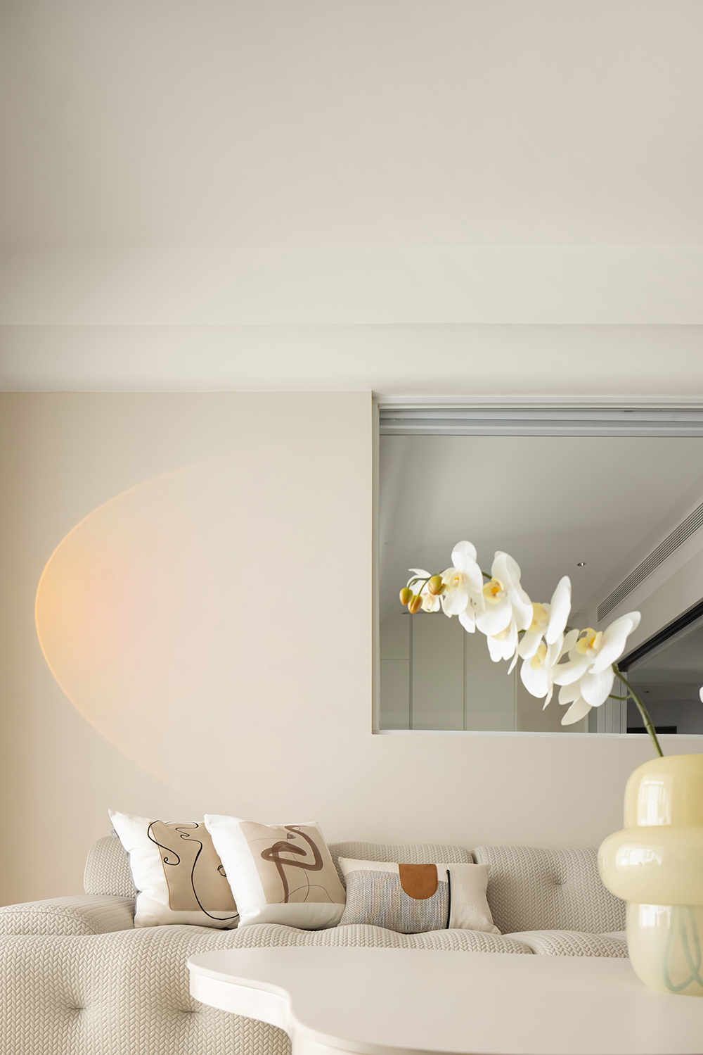 通过了解客户的品味和喜好,我们打通了客厅与阳台、餐厅与厨房,视觉上更觉通透敞亮,整体空间都以清浅温柔的奶油色调装饰,同时结合房屋原有架构,在处理梁和门洞时,我们使用了比较多的弧形来收口,给人一种流畅、柔和的感觉,能够缓解室内空间的硬朗感,增加室内空间的温馨感。