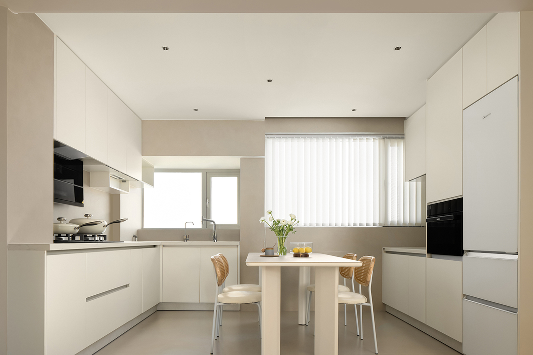 餐厅与厨房打通之后,空间更为宽敞,餐厨一体的设计一定程度上也增加了家人间的互动,拉进了彼此间的距离。厨房采用L型+一字型布局,中间部分区域保持原有的构造,两侧打造白色的地柜+吊柜,简洁的艺术设计搭配纯粹的色调,呈现出干净纯粹的清新的气息。