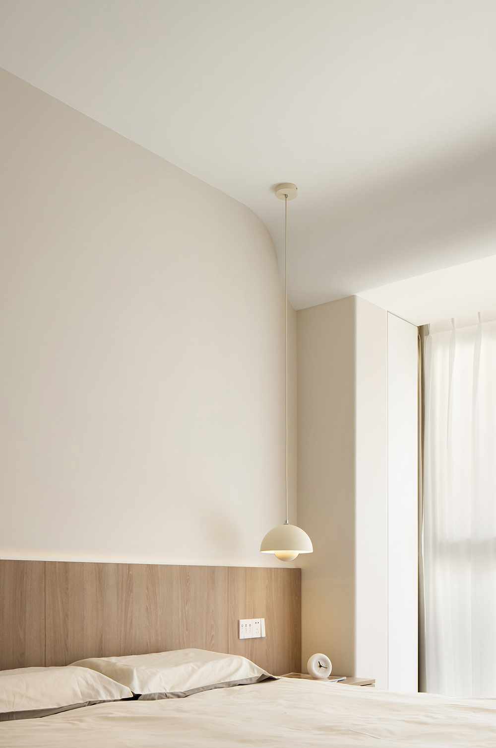 一部分阳台纳入主卧之后,为空间带来更优渥的采光和视野,整体被奶油色包裹,床尾墙面以弧形过渡至阳台,提升空间的舒适感。