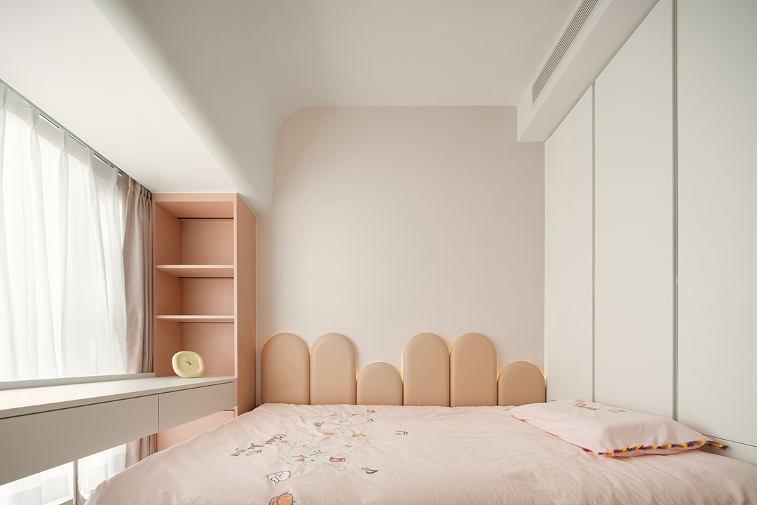 儿童房采用低饱和度的温柔色调+奶白色系,充满疗愈身心的力量,天花转角采用弧形过渡,勾勒出细节的轮廓设计,旨在空间视觉中心和空间立体感。