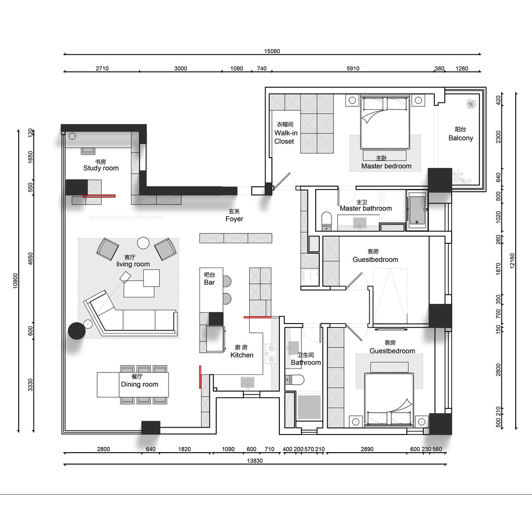 设计改动用三扇“隐藏式移门”让整个公区空间做到全开的通透状态或全闭后各自独立的状态。