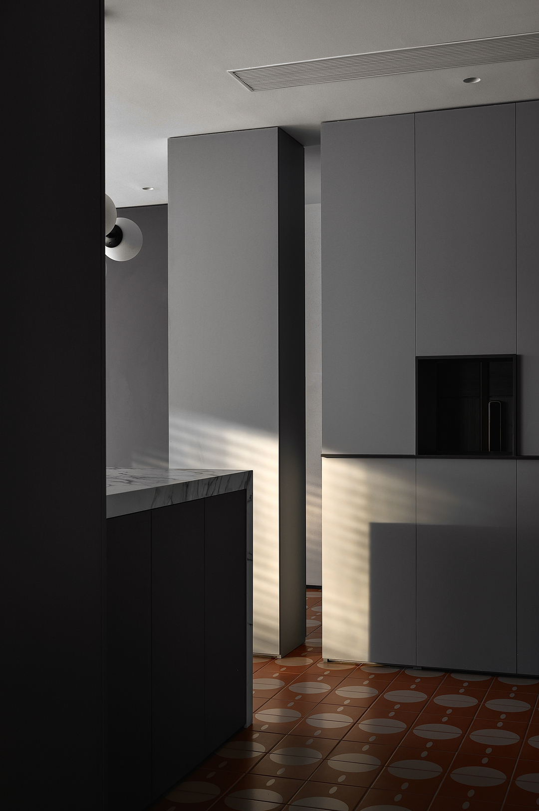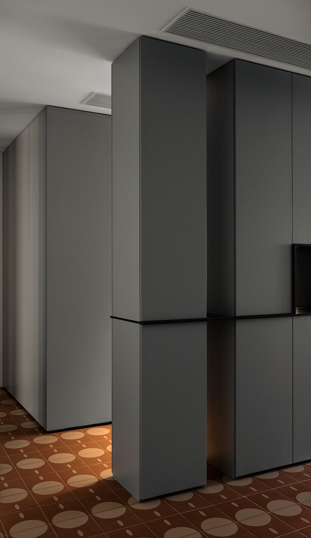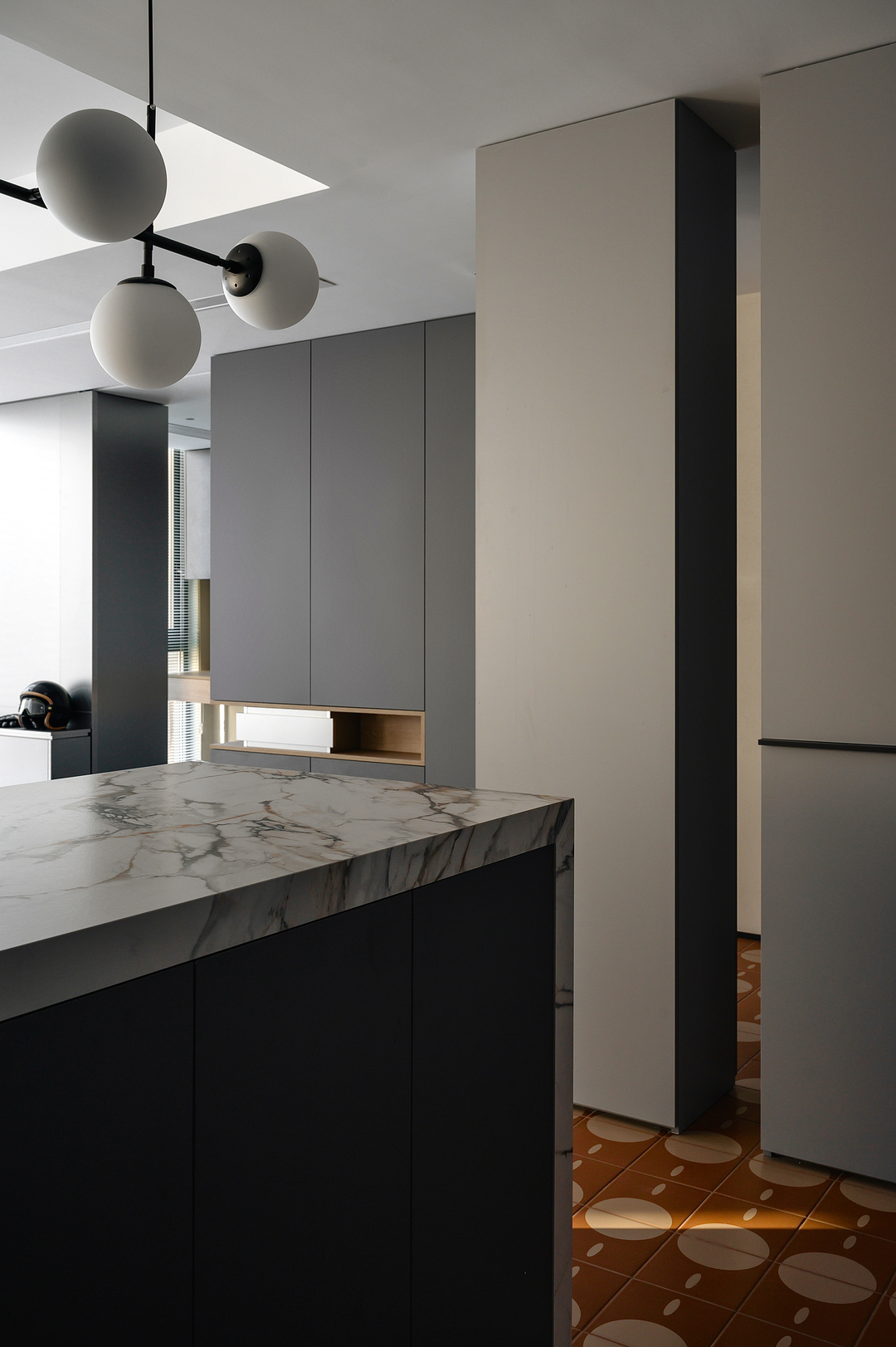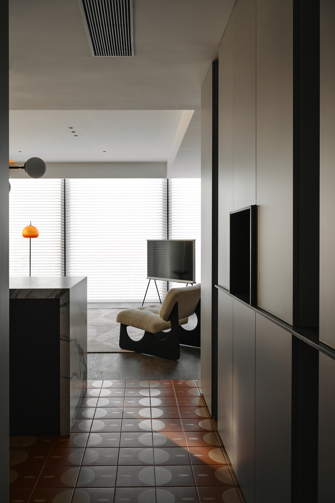入户玄关分隔出了十字动线,地面用不同材质的花砖区分,过渡场域。