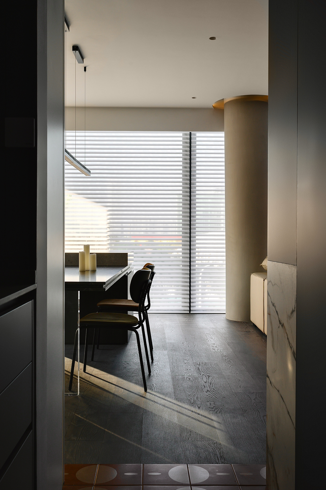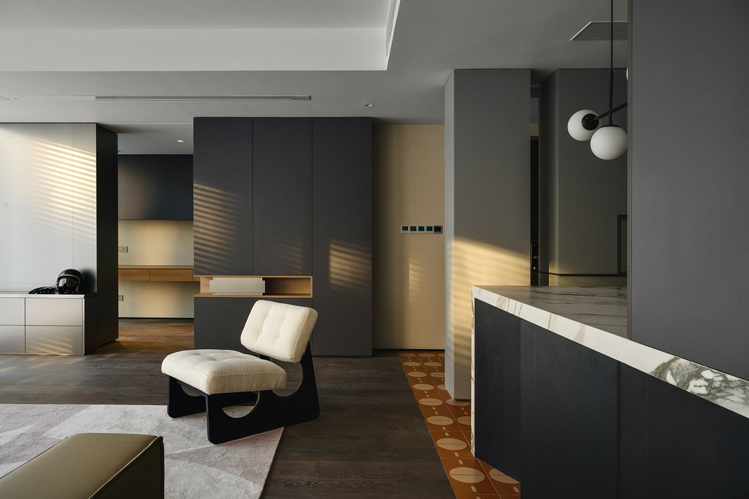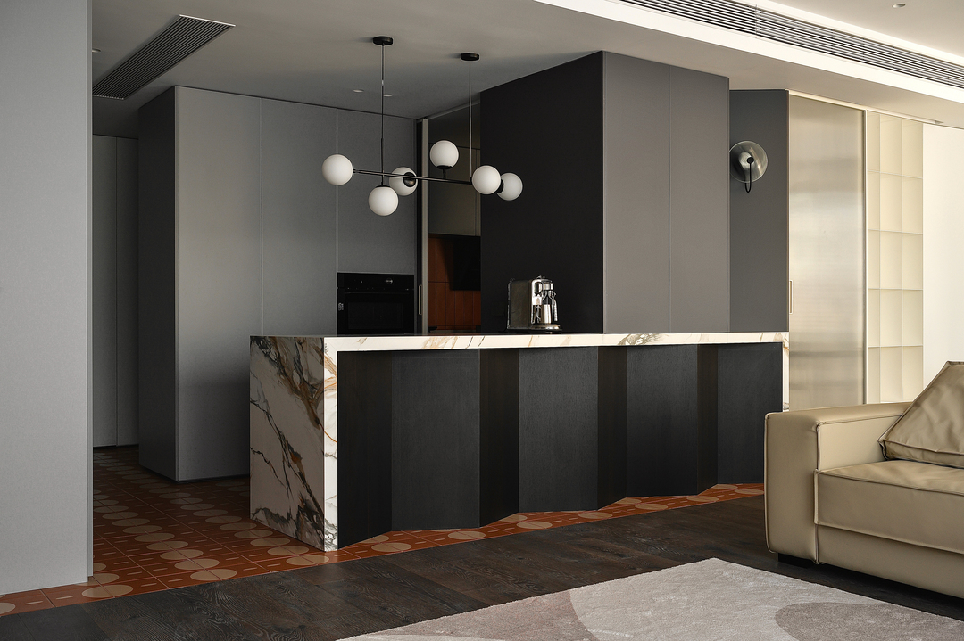 增加入户玄关后,动线被分流成两侧,延展出厨房的吧台与西厨功能,与客厅形成交互并与窗景互动,满足对着窗景早餐,小酌的感官体验,最大程度享受两面环窗户型带来的体验。