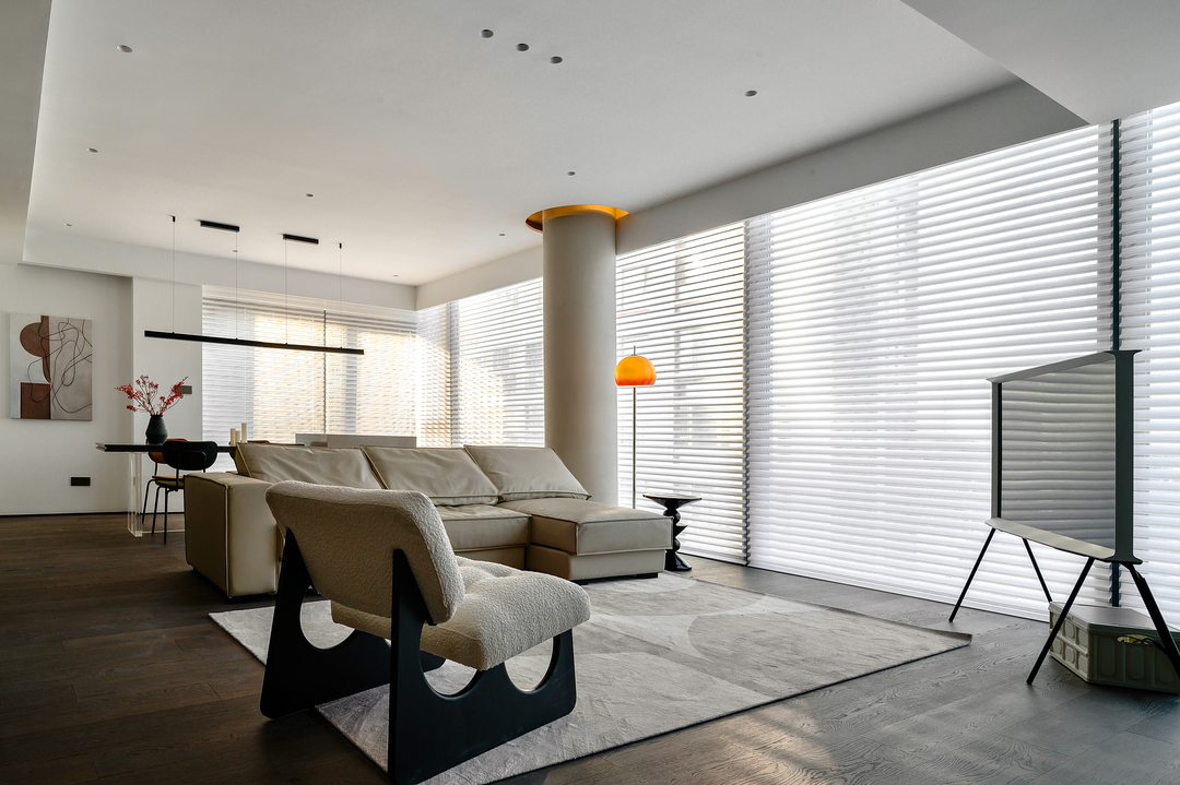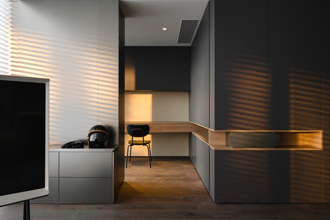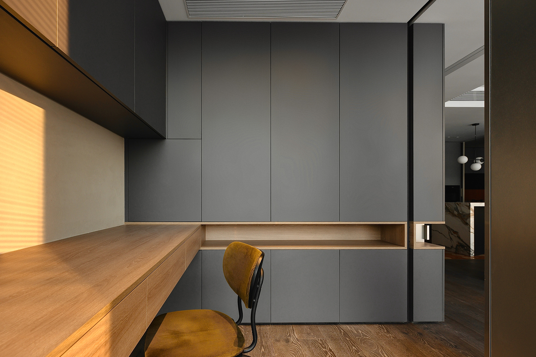 为了使客厅拥有更纯粹的体验,通过一道银色的移门区隔出书房,银色矮柜后的移门平时打开状态下作为墙饰,闭合状态下隔离出独立书房。