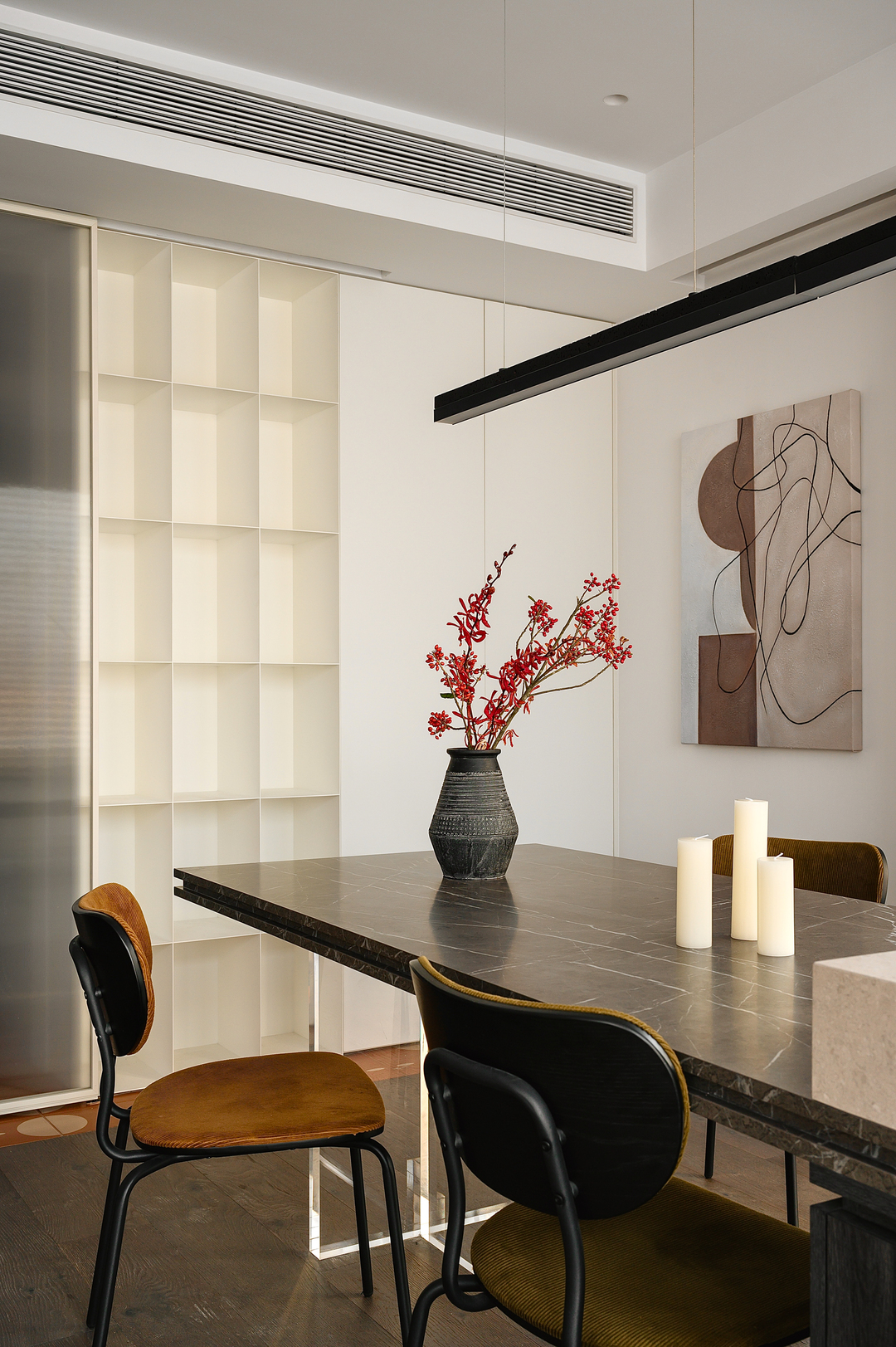 上海前滩烫金地段的精装修改造,我们在保留原本大致格局的前提下做了一些微小的处理,通过一条中轴线,将空间切分出动区与静区,我们利用这条中轴线展开设计调整,用三扇“隐藏式移门”让整个公区空间做到全开的通透状态或全闭后各自独立的状态。
