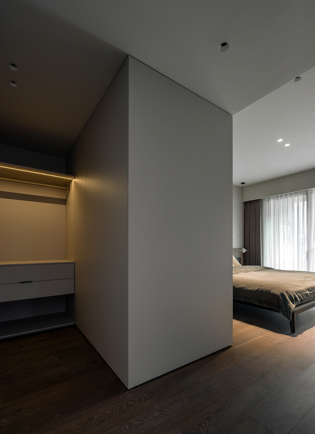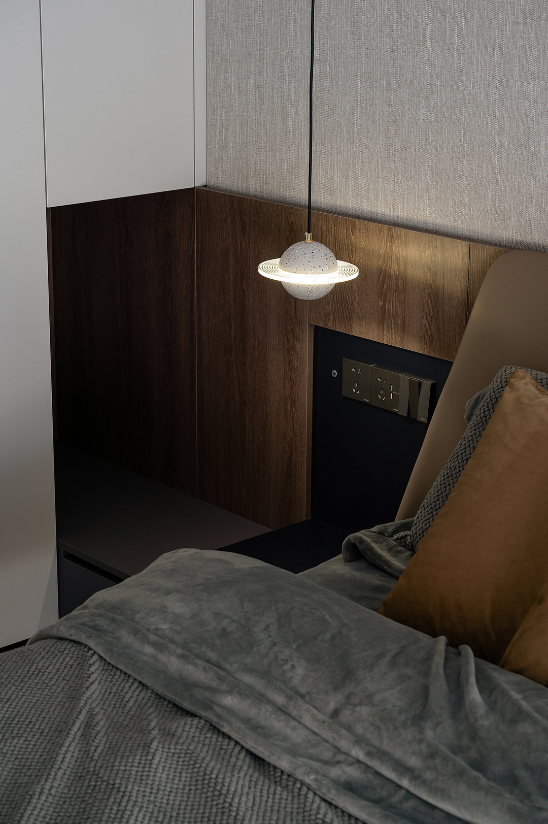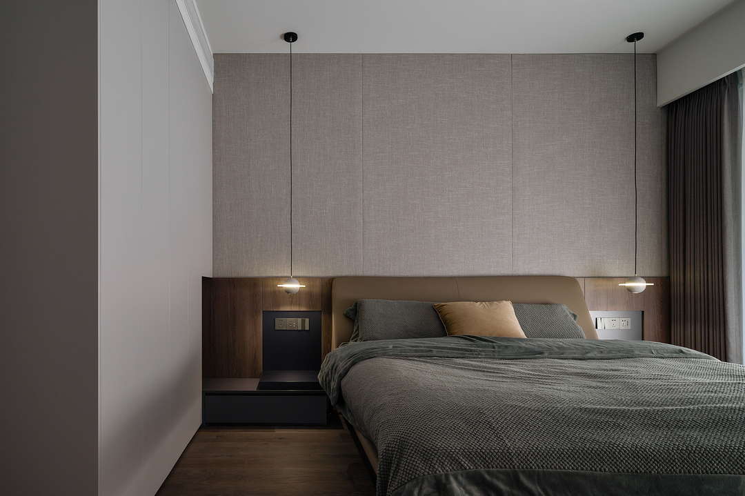 卧室增加了独立衣帽间,睡眠区用木皮与布纹作为床头背景,整体深棕色的基调温润沉稳。