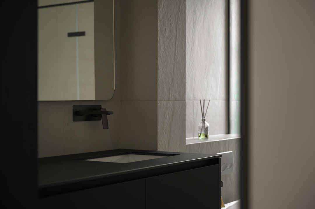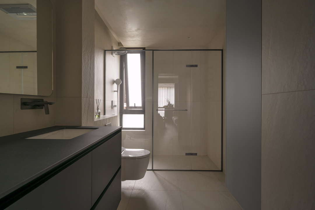卫生间我们选用带有肌理的墙地砖,配合窗外的自然光线很有质感。淋浴房无挡水条的无障碍做法对老人更友好,加大的淋浴区尺度考虑未来给老人护理洗浴的方便性。