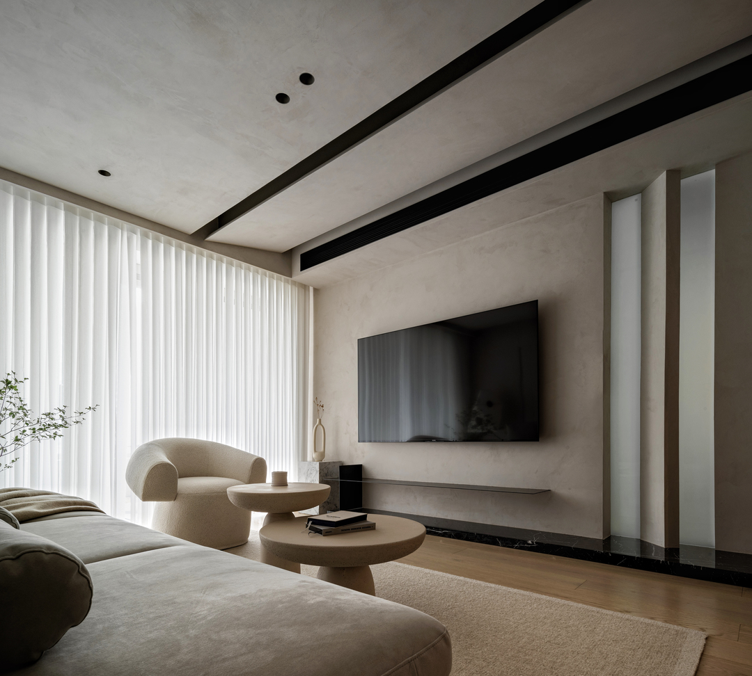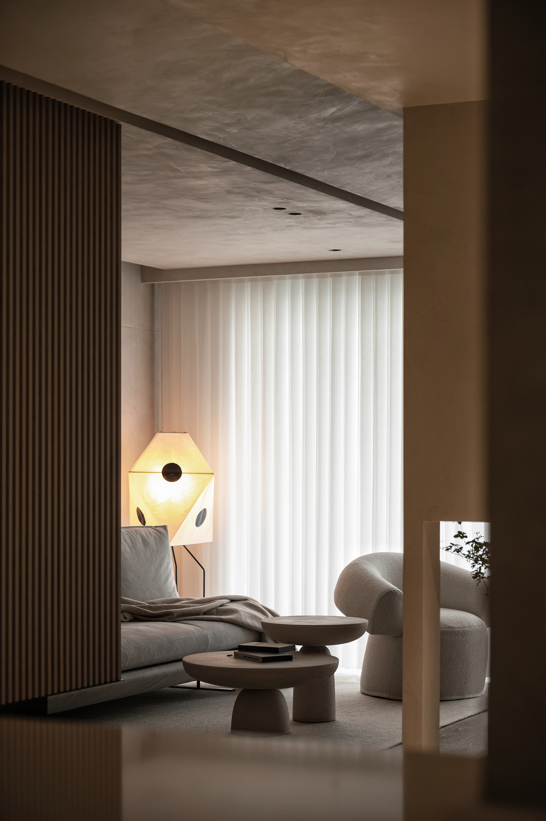 装饰层面我们选用微水泥大面积铺设空间,其特性是受光后的反射感比乳胶漆更柔和。