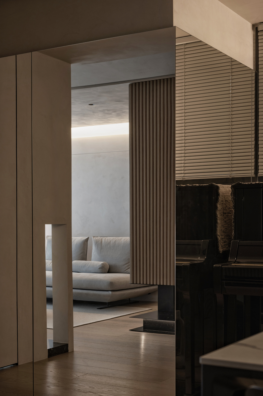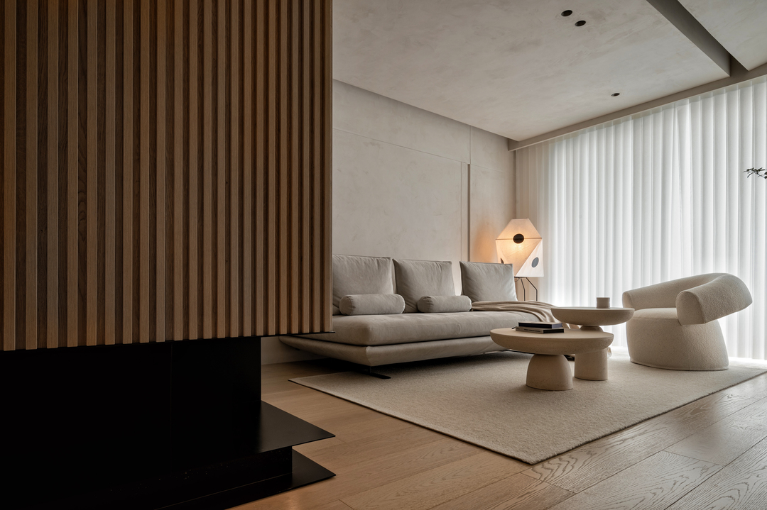 沙发后面用“线”和“面”装饰手法,恰到好处的跟微水泥配合,而不会喧宾夺主的每个材质都试图表达,试图成为空间主角,这样就会很乱而没有重点。