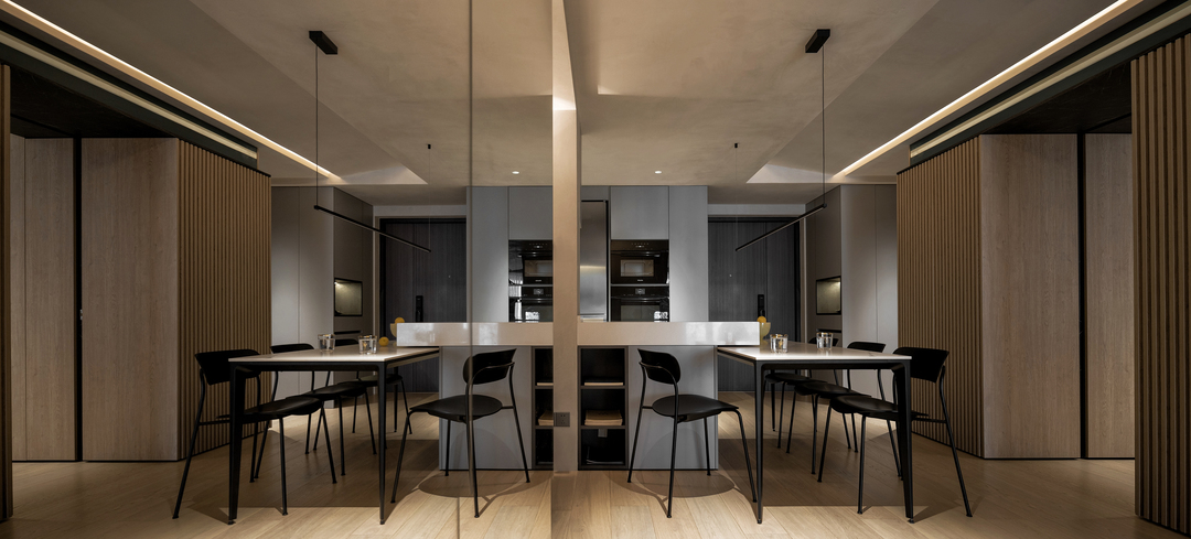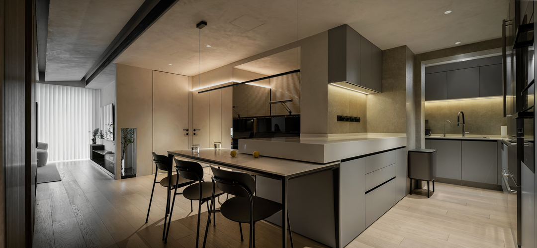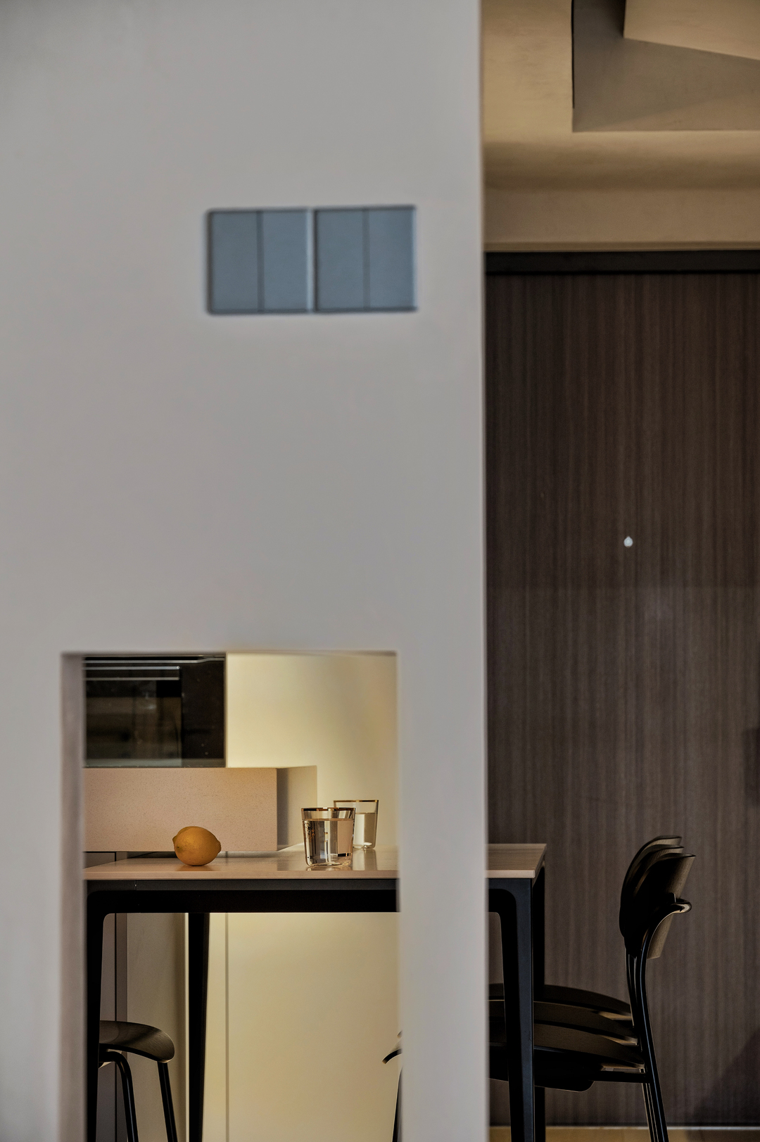 结构改造时我们打开了原本的封闭厨房,来解决原本入户后相对拥挤的体感,延伸出来的厨房操作台结合餐桌做了“嵌入式设计”。这样在平时大部分两个人就餐的时候能最大程度节省空间面积(餐桌部分被藏于操作台面下),多人就餐时可以将餐桌拉出。