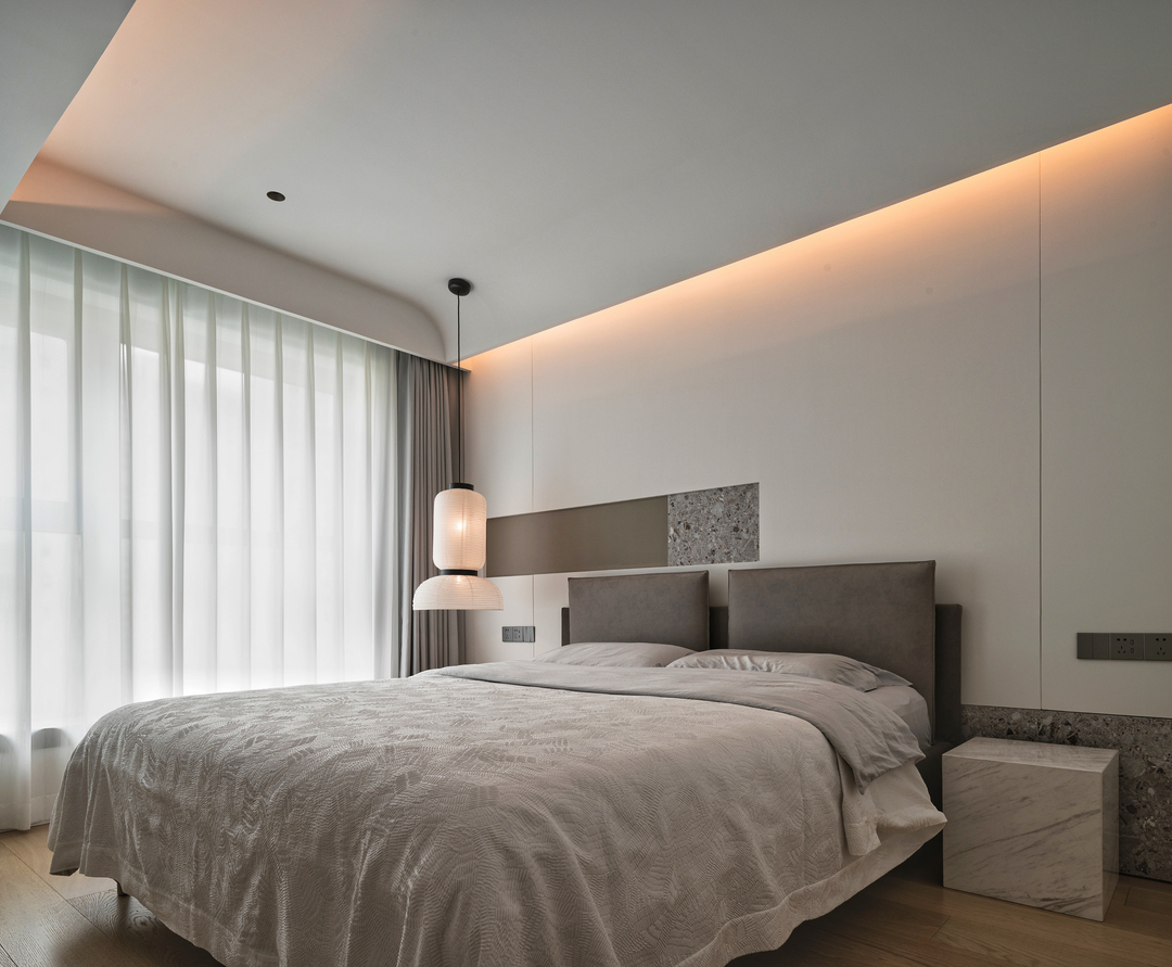 卧室作为睡觉的区域,空间调性不用特别复杂,同样是点线面的设计手法简洁明了,黑白灰色系的搭配不会显得单调也不会显得过分啰嗦。