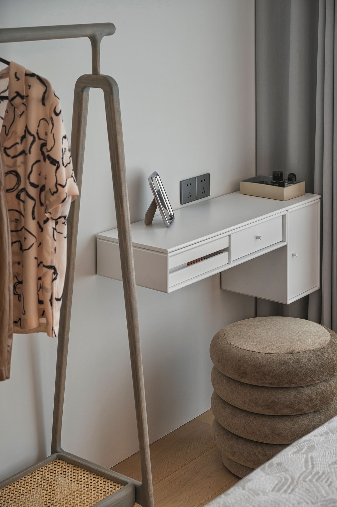 客卧预留出床位,但是几年内暂时作为演奏室与书房,隐藏式移门平时完全藏于柜体内没有存在感,视觉上像是互通的空间。多出来的走廊给视觉增加了通透性,也为毛孩子在家奔跑提供了条件。