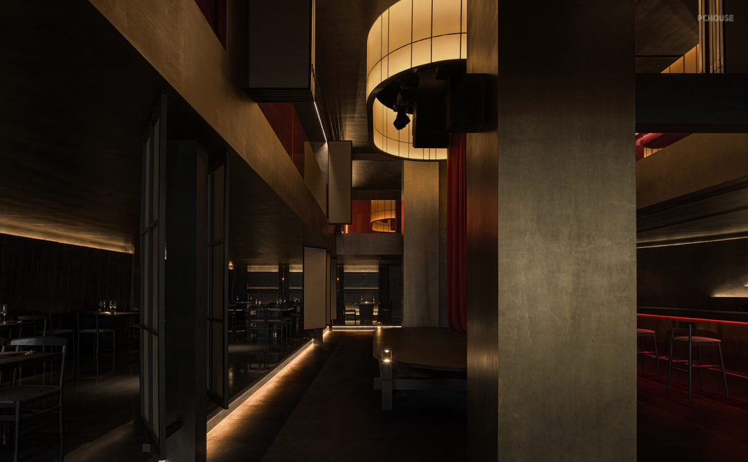 巨大的环形灯笼与舞台造型呼应,可将设备内藏其中,同时为二层的包厢提供视觉隐私。红色丝绒倾泻而下,使空间高度得到舒展。
