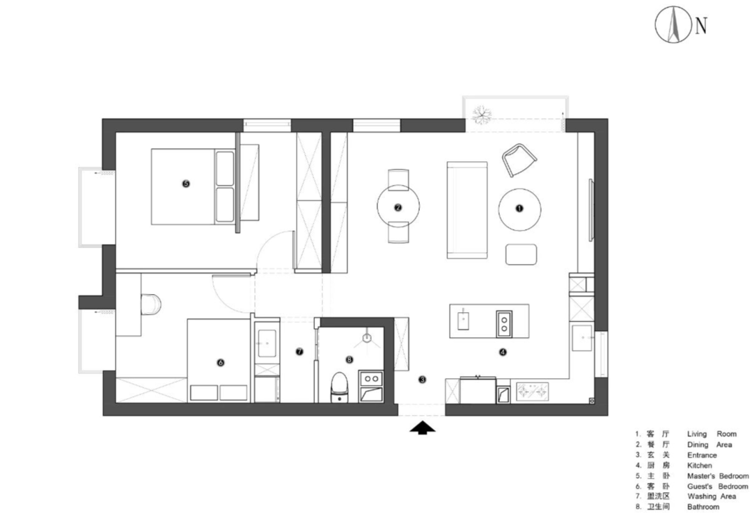 2、次卧墙体内推,卫生间区域变大,实现干湿分离;