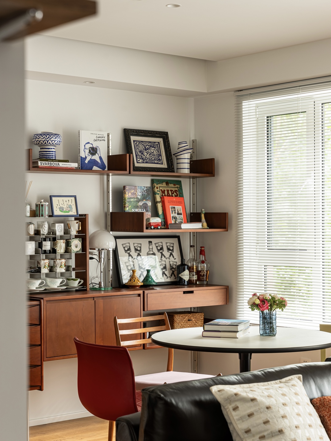 电视柜为开放式格子柜,放置业主喜爱的唱片、乐高再适合不过,还有壁龛、置物架等开放式储物,储物形式轻松随性,装满着他们对生活的热爱,功能性和情绪感都在这里得到释放。