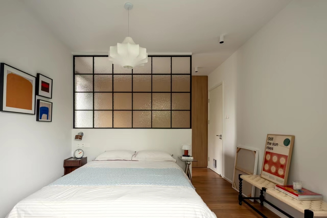 主卧空间较大且有两个窗户,我们利用隔断将原本空间一分为二,打造出一个步入式衣帽间。半墙+玻璃隔断的形式不会阻隔采光,同时也让卧室有更为丰富的层次。
